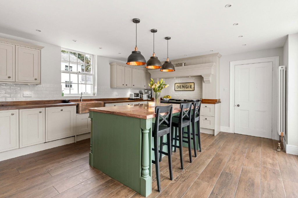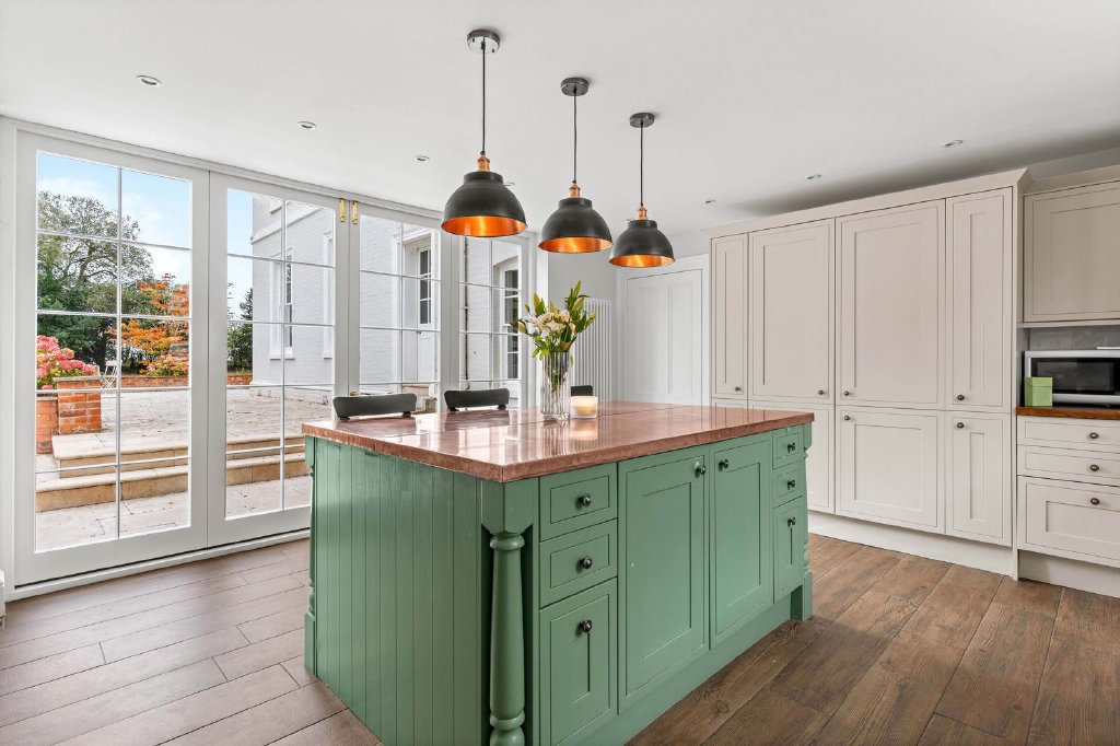 The residence offers three generous reception rooms, each boasting original fireplaces, floor to ceiling sash windows with shutters, panelling and high ceilings, creating a series of beautifully proportioned spaces for both formal entertaining and relaxed family living. Working from home is definitely an option with a dedicated study to the front aspect and a snug that could be used as a home office. An inner hallway with a cloakroom/wc. At the heart of the home lies the bespoke country kitchen, fitted with solid oak cabinetry and worktops, complemented by Porcelanosa flooring, a striking copper sink and matching copper-topped island, painted in Farrow & Ball green, add warmth and character, creating a truly inviting space for family living and entertaining with modern conveniences including a boiling water tap, integrated fridge-freezer and a Total Control 5-oven AGA, offering instant heat at the touch of a button. French doors open onto a sun-drenched terrace, perfect for alfresco dining and morning coffee. Practicality is seamlessly woven into the design, with a walk-in pantry, a boot room, and a dedicated laundry room, all providing access to a dry cellar, ideal for additional storage or conversion into a wine room.