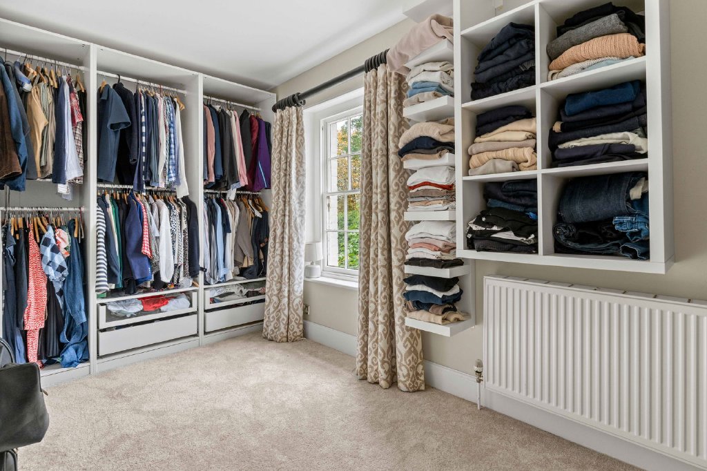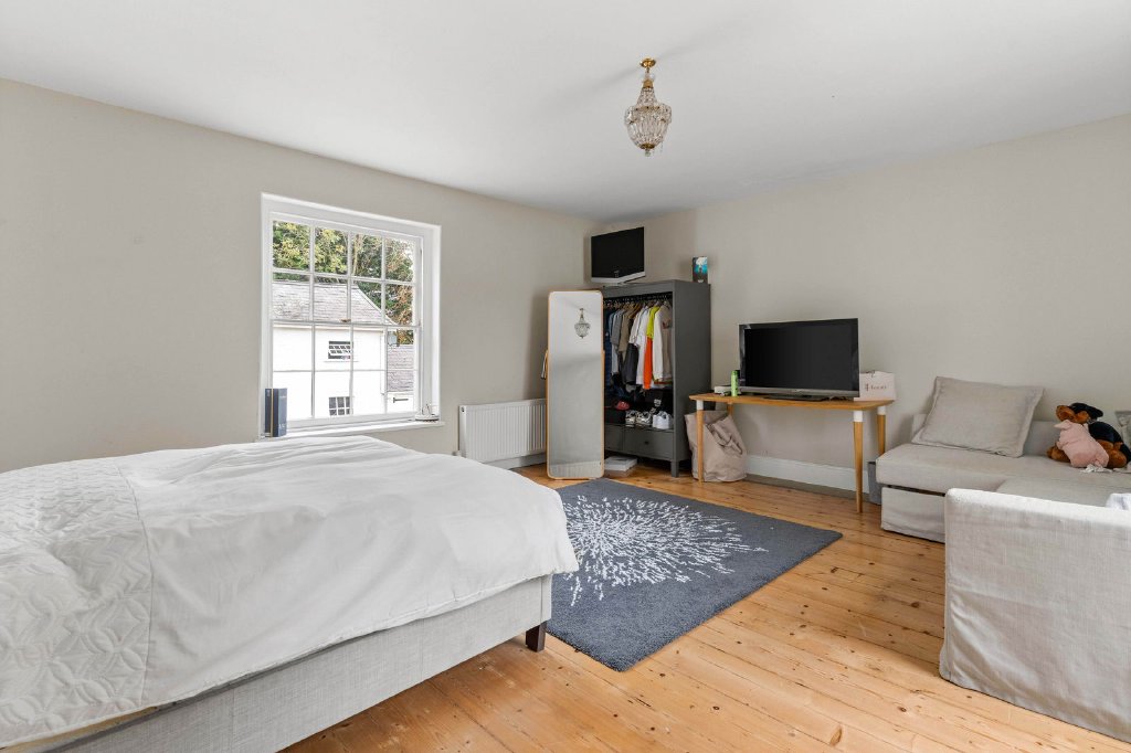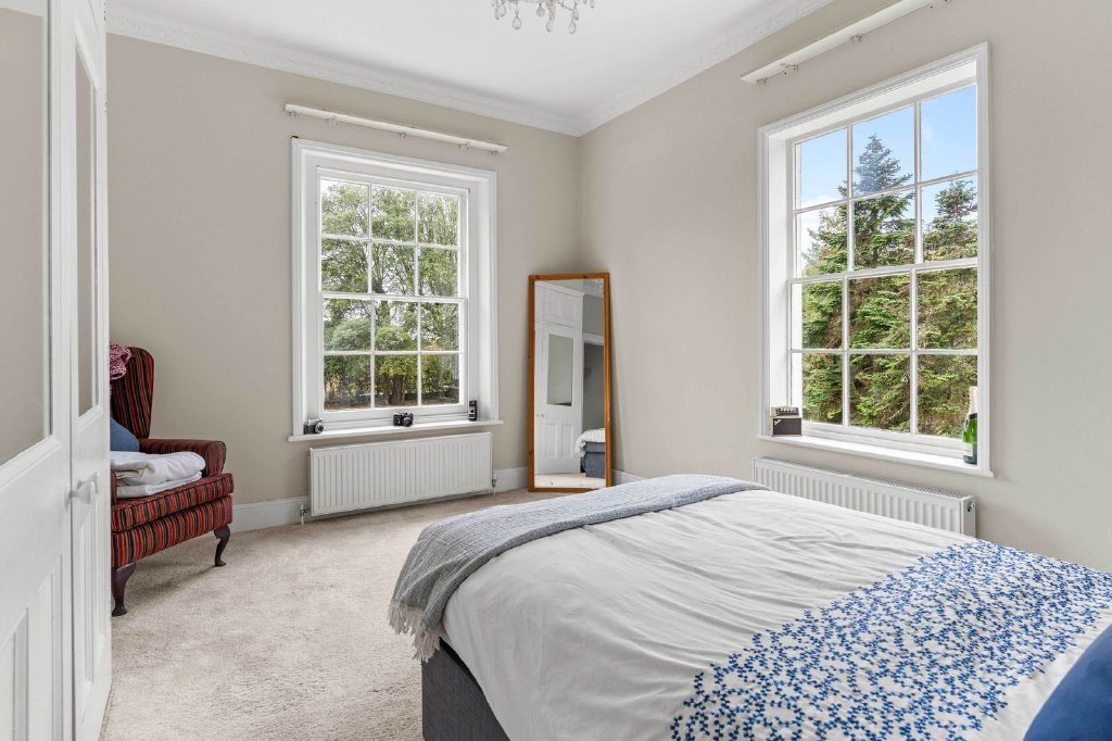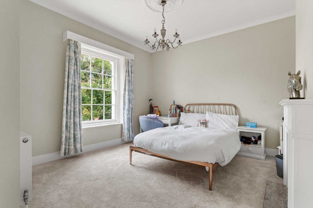 A sweeping staircase ascends to a light-filled landing and the six generously proportioned bedrooms, three to the front part of the property including the principal bedroom, a serene retreat, complete with an exquisite en-suite featuring underfloor heating and a cast iron bath. Two further bedrooms on this level offer fitted wardrobes and open, picturesque views. A secondary landing, with elegant wooden flooring, provides access to three additional bedrooms, one currently used as a dressing room and steps up to a family bathroom, thoughtfully designed with underfloor heating, a cast iron bath, and a separate shower.