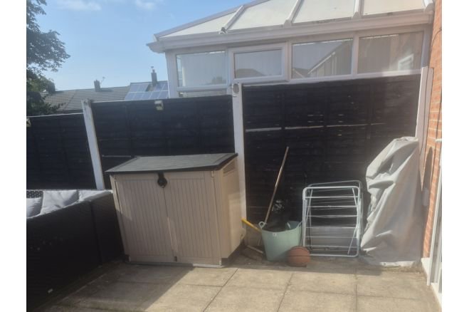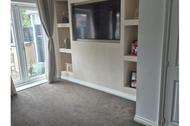 Three bedroomed semi detached house with large living room with media wall, kitchen, bathroom, downstairs toilet, under stair storage. it has a garden to the rear with flags artificial grass composite decking and a 5x5metre outer building currently used as a bar with electricity. The front of the house has a tarmac drive to fit 2 cars.