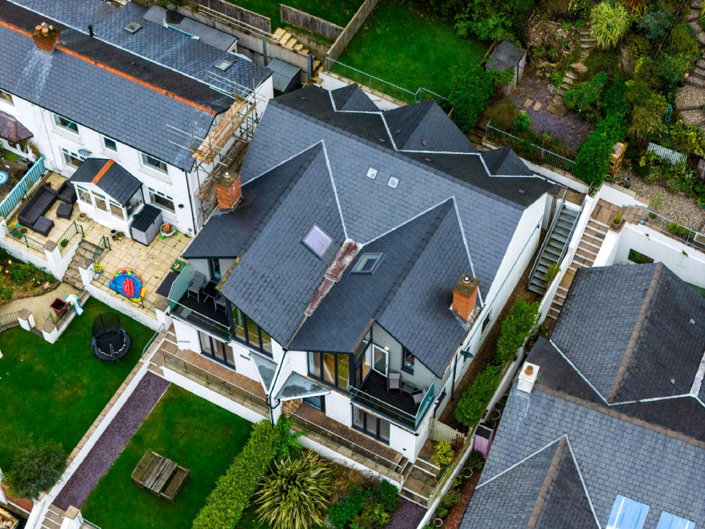 This impressive upside down home features three double bedrooms, three bath or shower rooms, and a stunning open plan first floor living space with vaulted ceilings, a wood burning stove and floor to ceiling glazing that floods the interior with natural light. From the living area, doors open onto a balcony where you can take in breathtaking views across the harbour and rolling hills beyond, the perfect setting for morning coffee or evening sunsets.