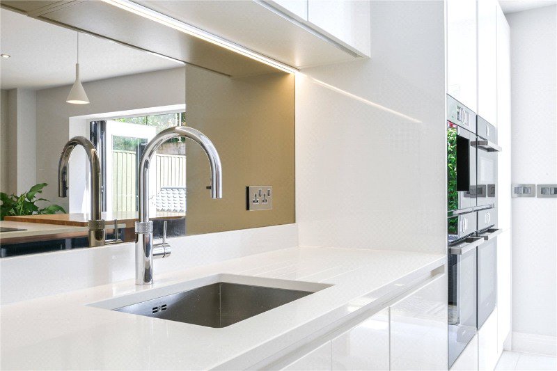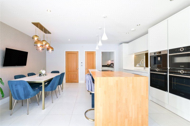The ground floor has a welcoming entrance hall, which leads through to the fabulous open plan kitchen/dining room with bi-fold doors opening into the garden. This space is essentially the hub of the house, and is great for a busy family lifestyle. The beautiful worktops, modern contemporary gloss finished units, and high spec integrated appliances will be attractive to anyone who spends a lot of time in the kitchen. There is an adjacent utility room, a downstairs cloakroom, and a study which is currently used as a home office.