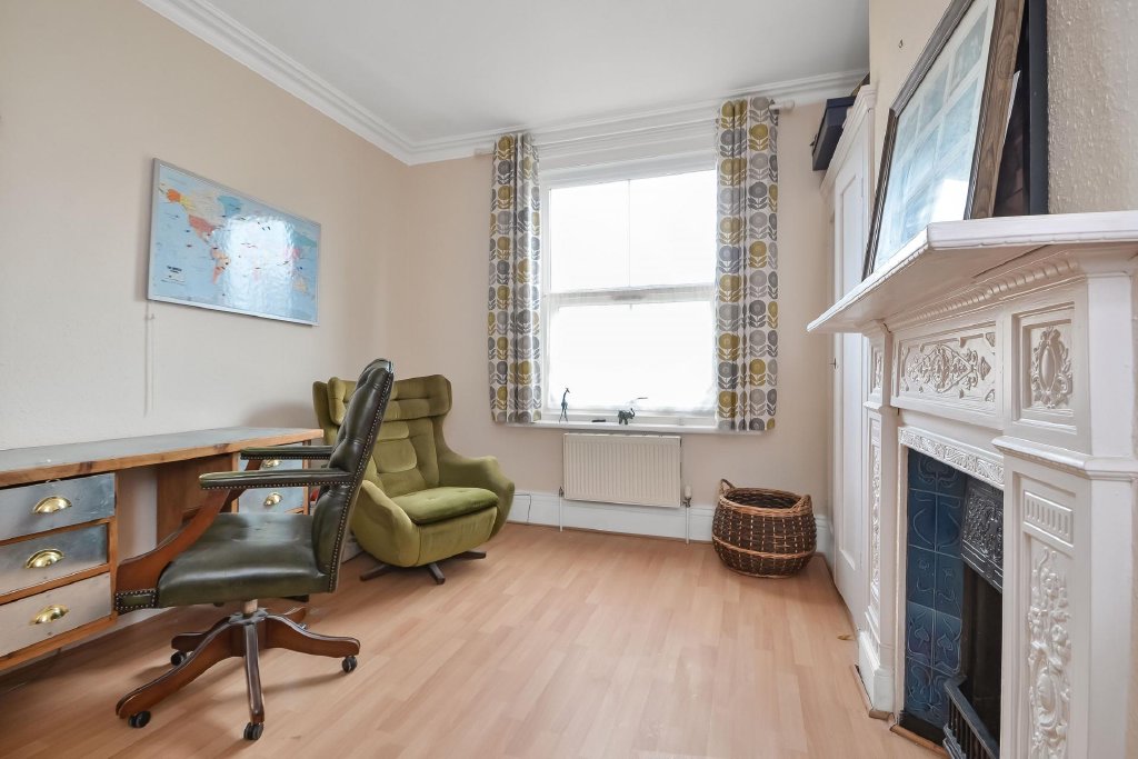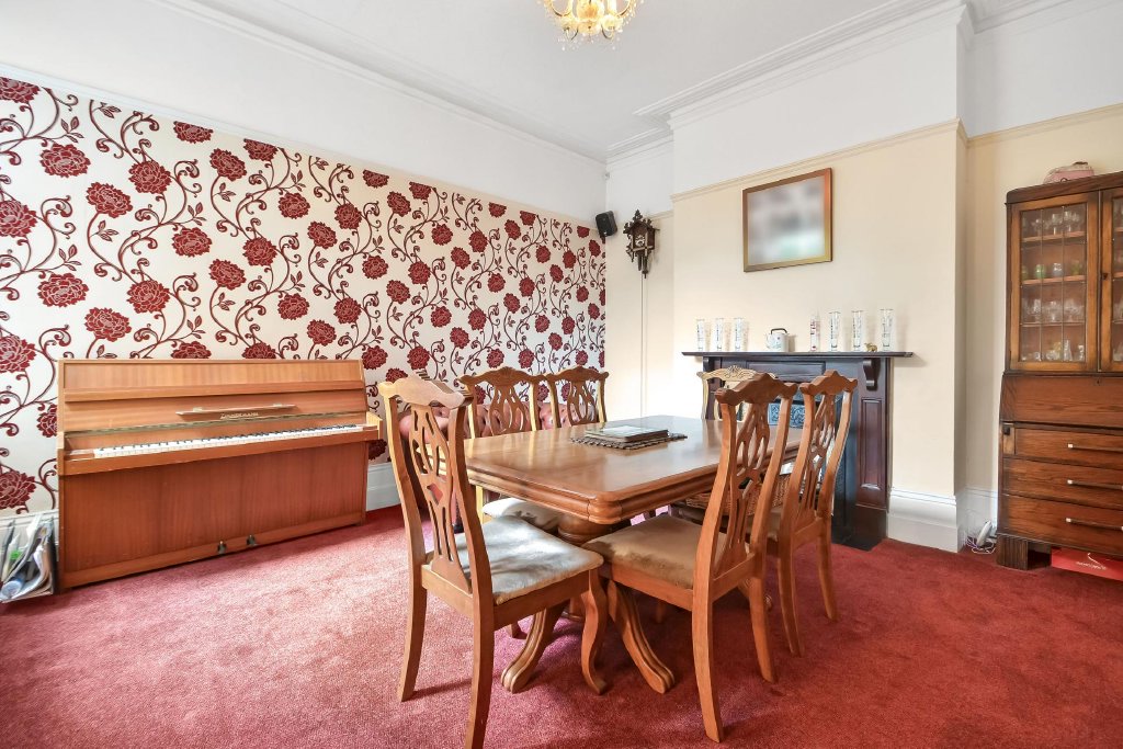 DINING ROOM 14' 11" x 13' 5" (4.55m x 4.09m) High ceiling with coving, picture rail, high skirting boards, double glazed sash window to front aspect overlooking entrance, radiator with cover over, central chimney breast with wood surround, cast iron inlay with inset tiles and black tiled hearth.