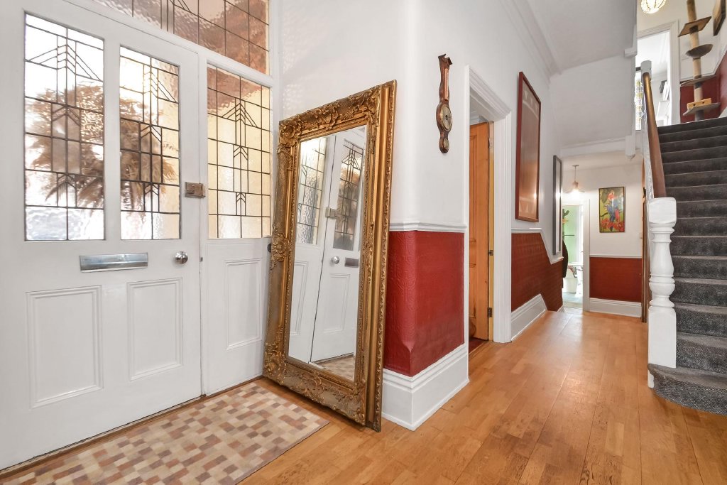 HALLWAY High ceiling with coving, high skirting boards, dado rail, balustrade staircase rising to first floor, radiator with cover over, doors to primary rooms, steps down to lower hallway and door to basement, large built-in cloaks cupboard, wood laminate flooring, panelled doors to primary rooms.