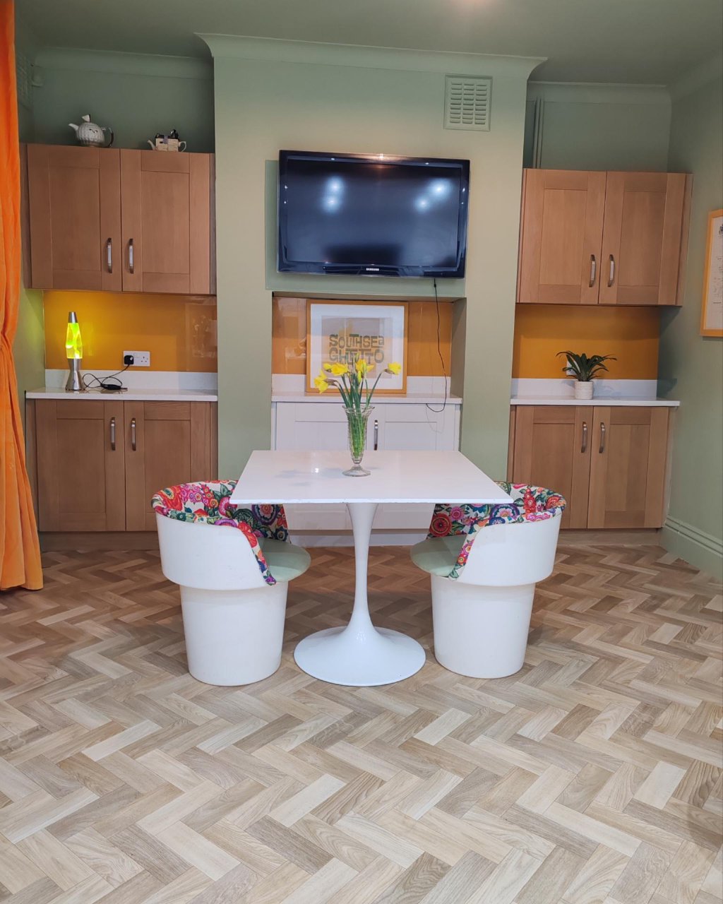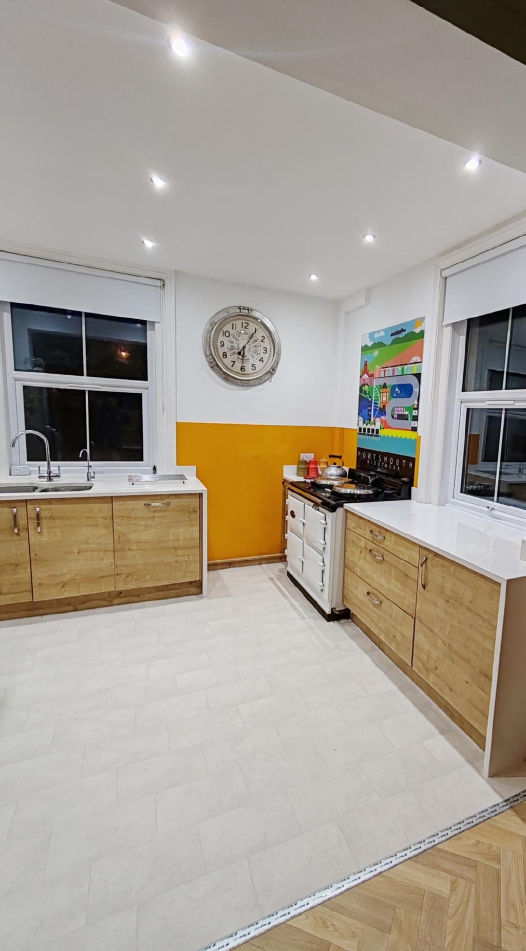 Kitchen: Range of matching wall and floor units with quartz work surface and orange glass splashbacks, inset double bowl sink unit with mixer tap and drainer to one side, integrated dishwasher with matching door, range of drawers, twin double glazed windows to side aspect, pan drawers, matching flooring, double glazed window to rear aspect, space for American style fridge/freezer, Aga for cooking only with twin circular hot plates and three ovens (new 2013), feature glass bespoke splashback depicting features of Portsmouth and Southsea, ceiling spotlights.