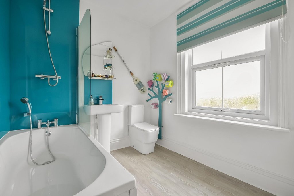 FAMILY BATHROOM White suite comprising: panelled bath with mixer tap and shower attachment and separate shower over, pedestal wash hand basin, low level w.c., feature turquoise glass splashbacks, double glazed window to rear aspect, chrome heated towel rail, built-in airing cupboard housing hot water cylinder and separate Ideal Logic boiler supplying domestic hot water and central heating (not tested).