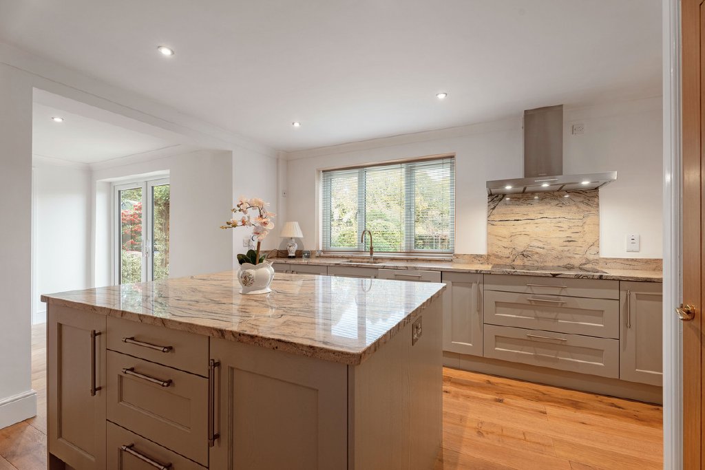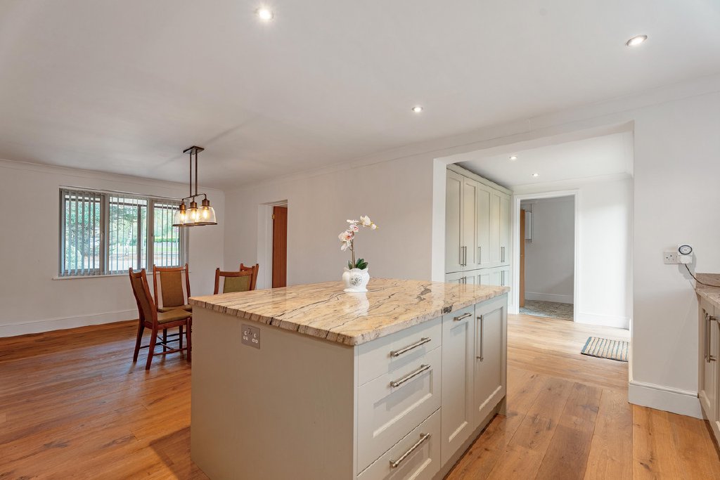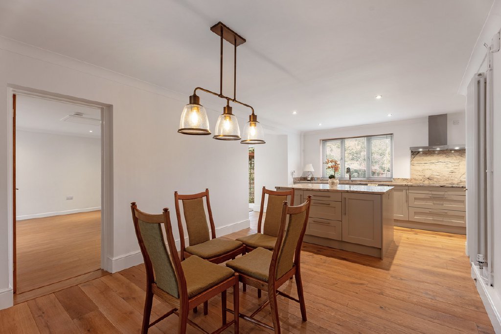 - Enclosed porch, hall, superb kitchen with dining area, utility room