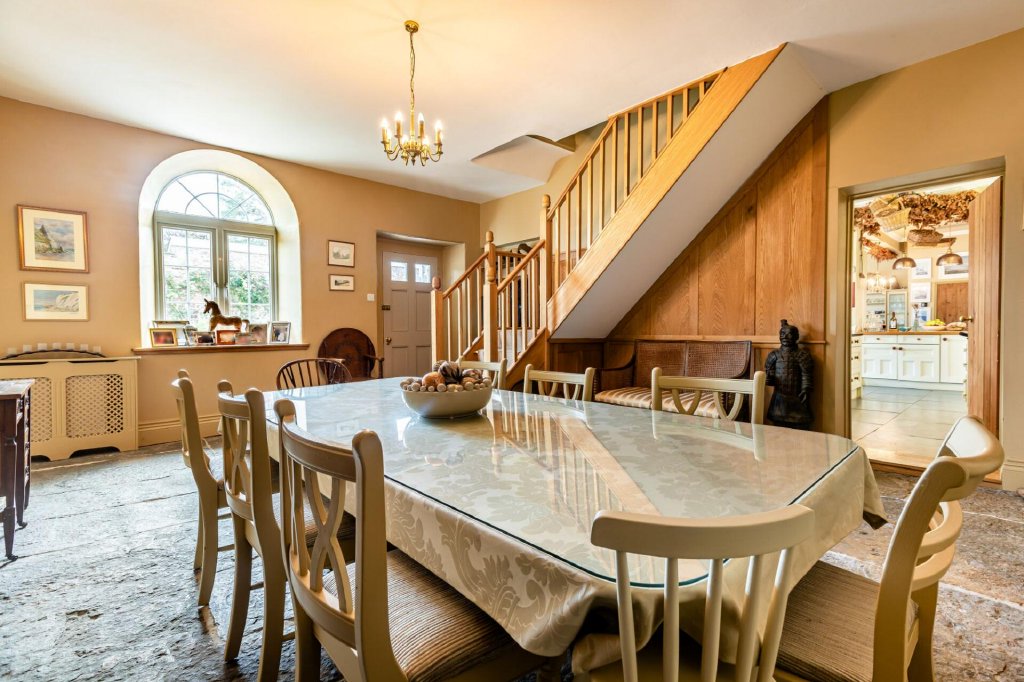 The dining area features a charming window seat and ample space for a centrally placed dining table. A chandelier and statement pendant lights add a touch of elegance. Bespoke cabinetry and open wine storage add both style and function. An impressive reception hall showcasing a striking oak staircase, authentic flagstone flooring, and generous space for a large dining table is perfectly suited for formal gatherings and entertaining.
