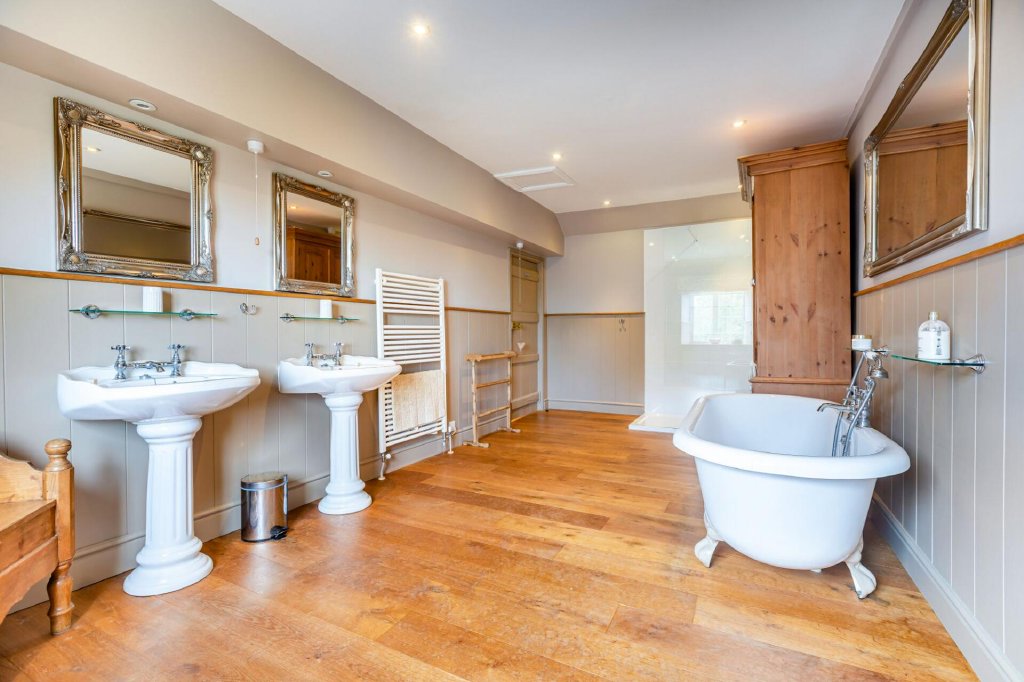 The luxurious main bathroom is generously proportioned and exudes classic elegance, blending period-inspired details with modern convenience. It features a large walk-in shower enclosure and a freestanding claw-foot bathtub positioned beneath a wall mirror, creating a calm and relaxing space to unwind. Twin pedestal basins add both practicality and style.