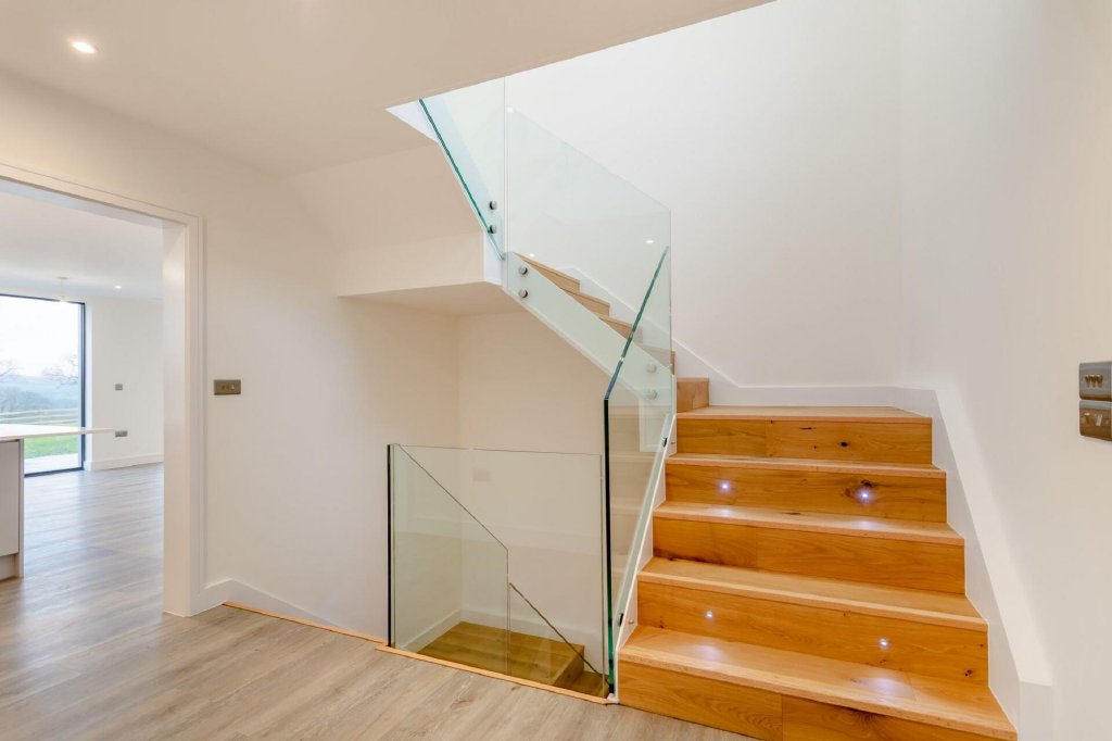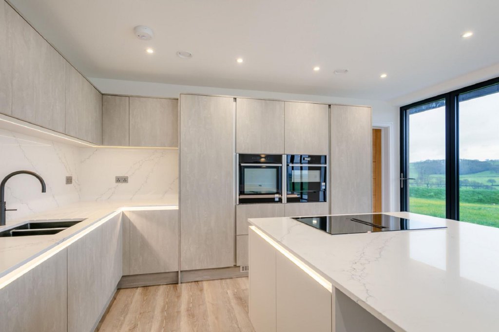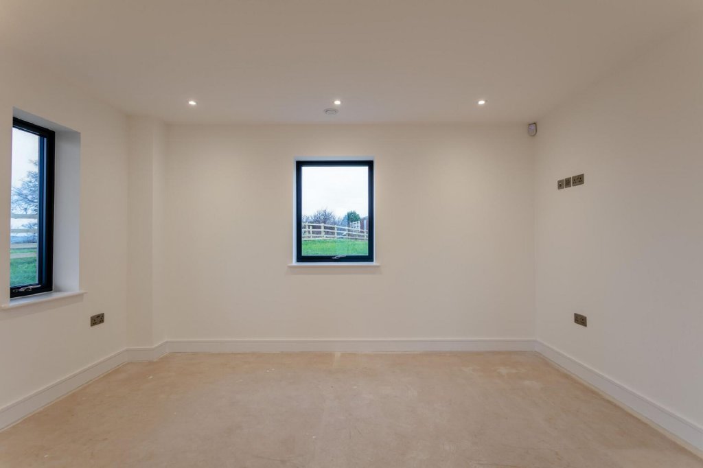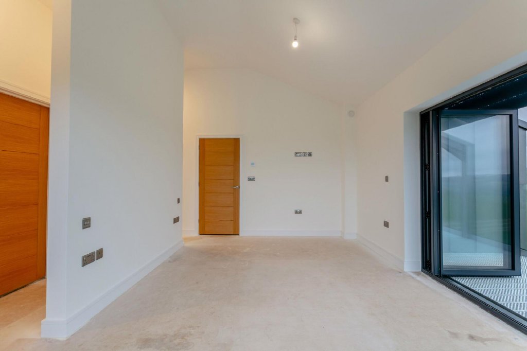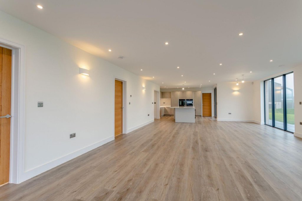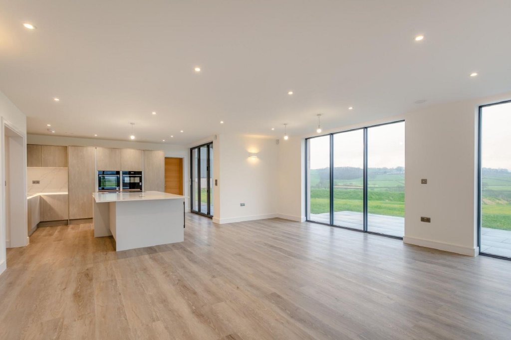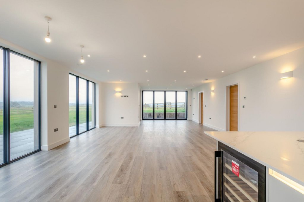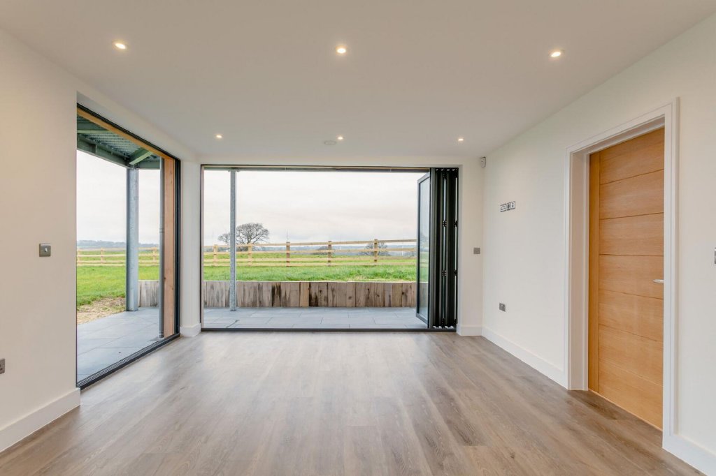 The expansive open-plan kitchen and dining area is a true highlight, featuring floor-to-ceiling windows and bifold doors that seamlessly connect indoor and outdoor spaces, allowing you to fully immerse yourself in the stunning countryside.