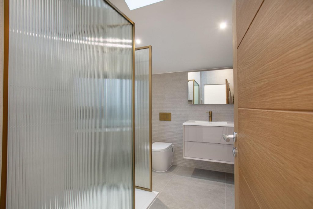 The second floor boasts five double bedrooms. Two of the bedrooms open onto a private balcony via bifold doors, enhancing the stunning views and providing shade for the rooms below. These rooms benefit from a thoughtful design, featuring a dividing wall that accentuates the high ceilings and discreetly conceals an en-suite bath and shower room. The master suite also has the luxury of its own dressing room.
