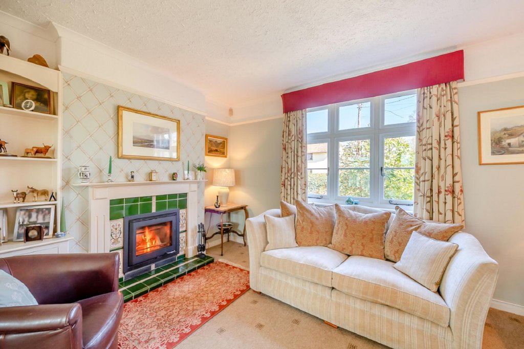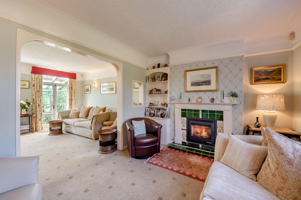 A dual-aspect reception room with Edwardian fireplace flows into a conservatory and out onto the sun terrace.