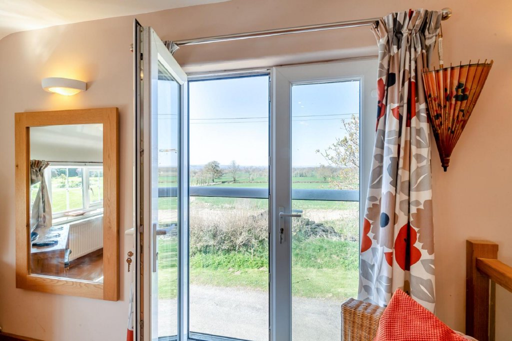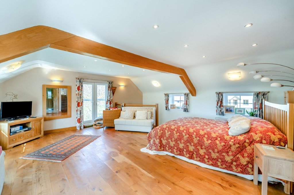 A luxurious master suite with triple-aspect countryside views, Juliet balcony, en-suite shower room, and dressing room.