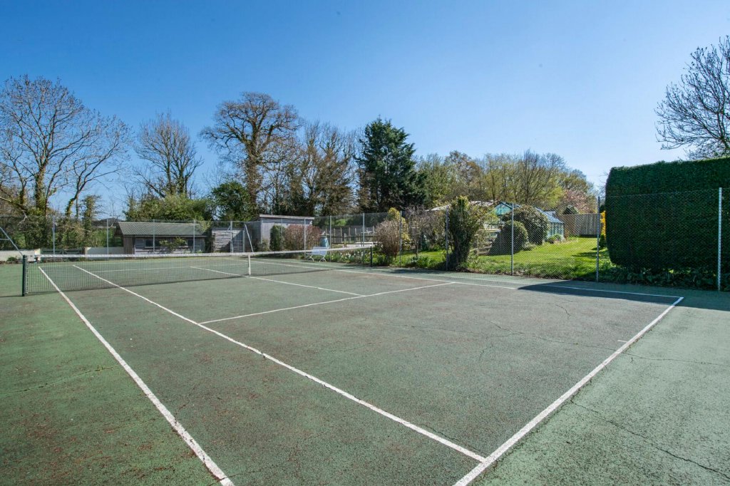 A gravel path connects the house to the swimming pool, flood-lit tennis court, and beyond to the kitchen gardens.
