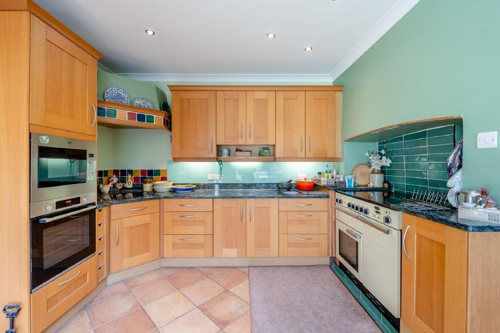 The extended kitchen and family room opens through sliding doors to the rear terrace and garden, with light flooding in through large windows and Velux skylights.