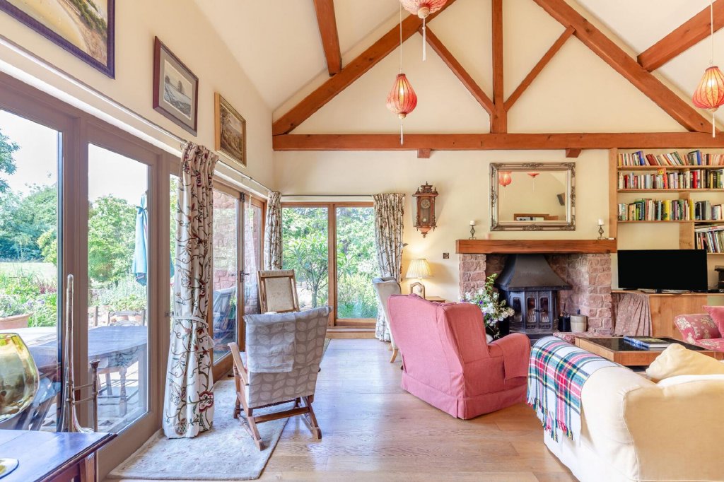 Accessed from the hallway or kitchen, the sitting room features a stunning vaulted ceiling with exposed beams and a large striking fireplace. Windows and French doors run along one side of the room and into the corner, filling the room with natural light in this dual aspect room. From here, beautiful views can be enjoyed in comfort.