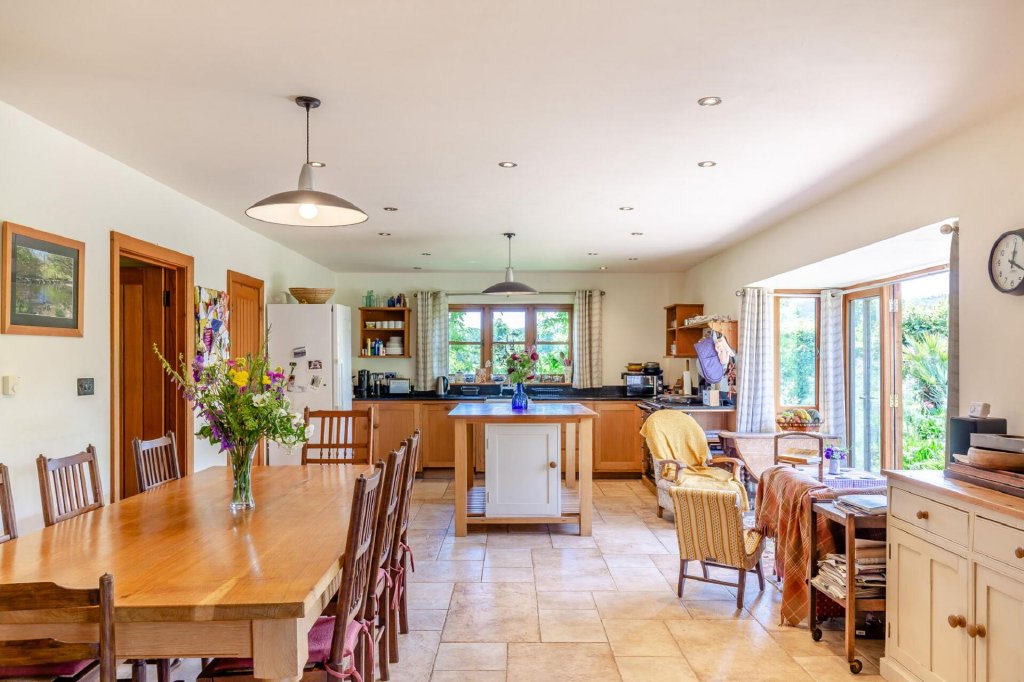The heart of the home is the spacious open plan kitchen and dining room with solid oak doors that connect through to the sitting room and a glazed bay seating area with French doors extends into the garden, providing the perfect space to view the stunning and tranquil grounds.
