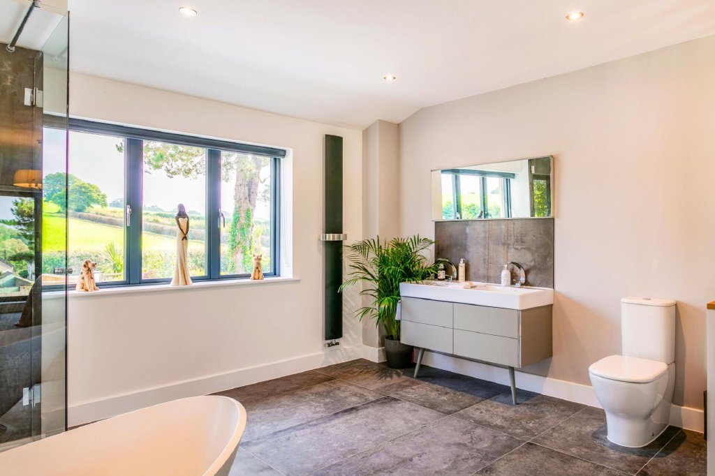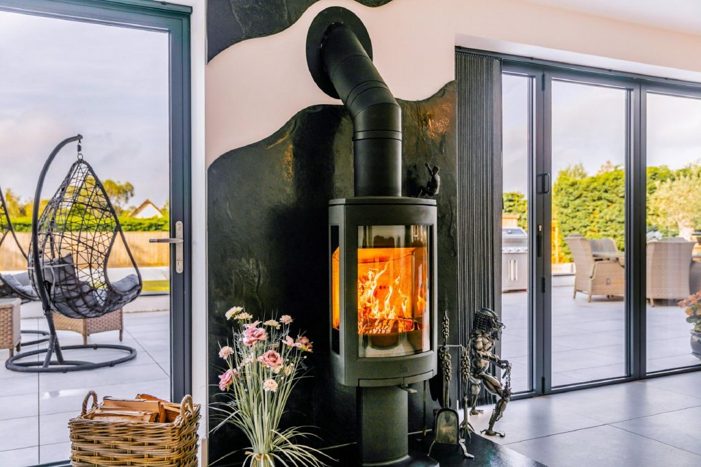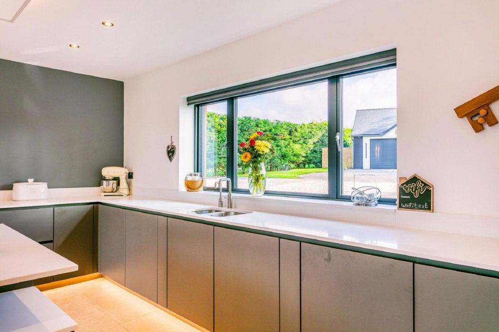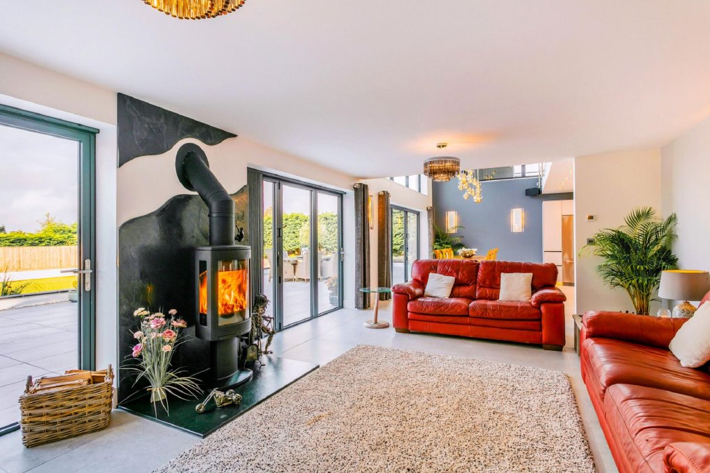 The sitting room whilst sizable retains a cosiness courtesy of the large plush high pile area rug laid over stone flooring, curved wall and statement wood burner. Picturesque views from the bifold doors open the room to the outside, allowing you to enjoy watching the outdoors from this cosy spot.