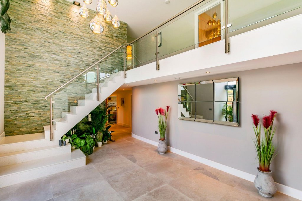 A stunning double height entrance with beautiful cluster pendant lights creates an unforgettable first impression as you enter this breathtaking home. A stunning stone staircase rises alongside a wall of striking split-face tile, strategically placed downlighters highlight the texture of this pretty tile.