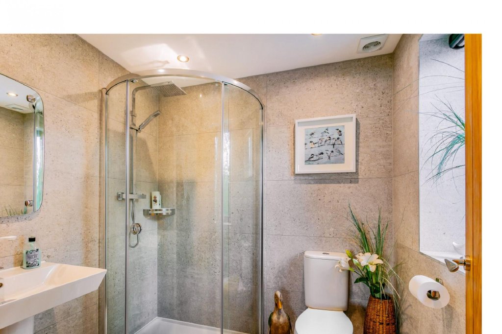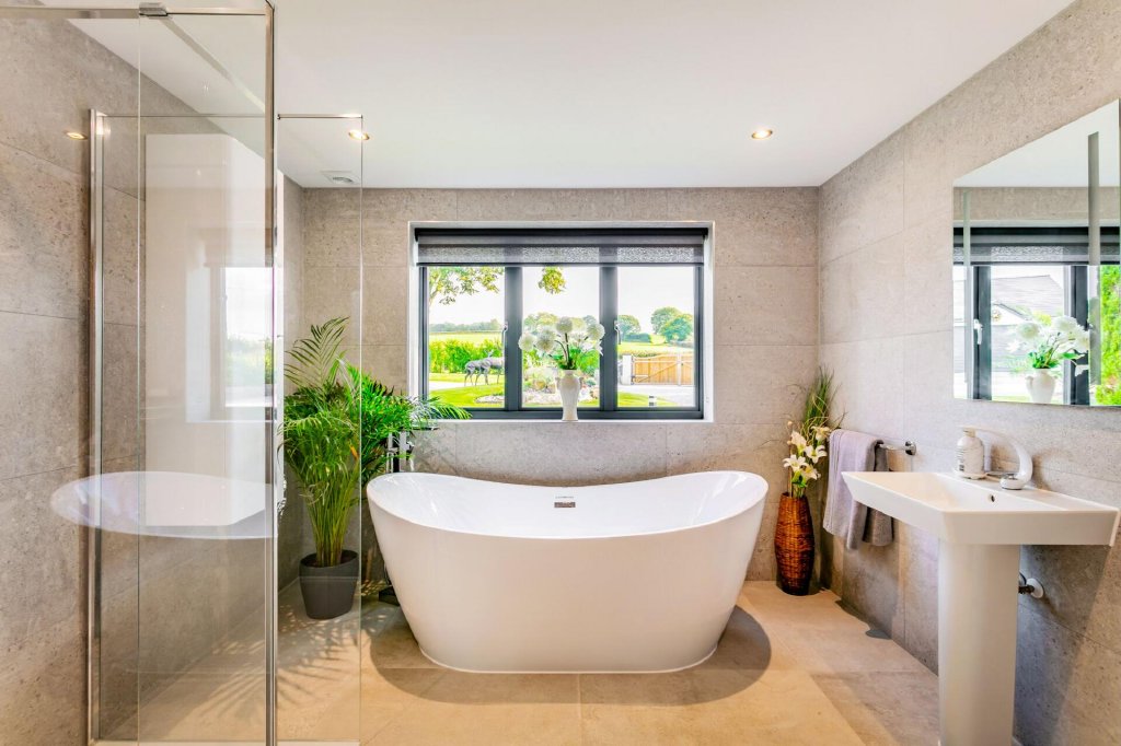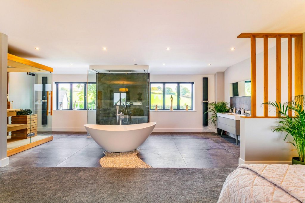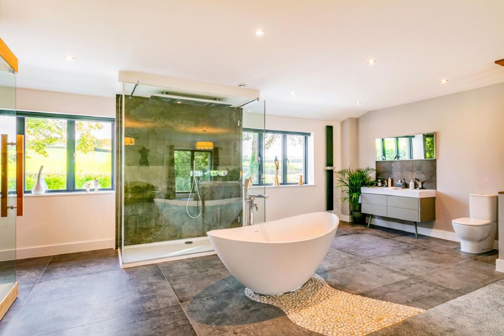 A fully tiled luxury bathroom completes the ground floor. There is a walk-in shower enclosure with monsoon shower head, and a freestanding whirlpool bath stands centre in the room.