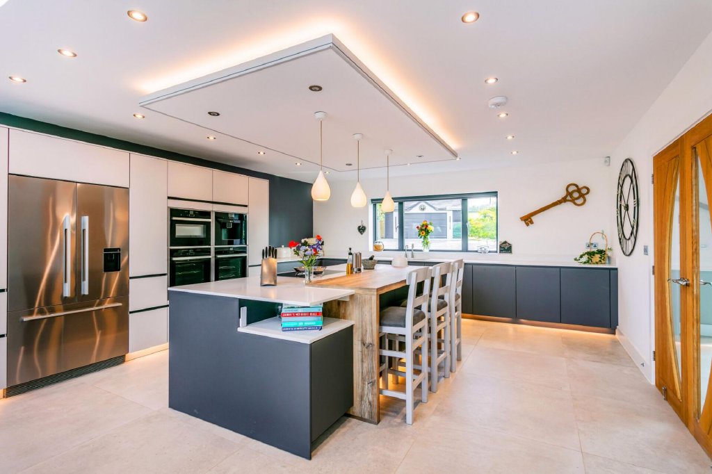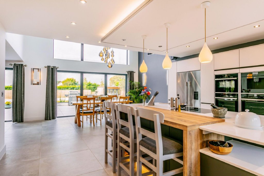 A large opening leads through to the modern open-plan kitchen/dining/siting room with a series of bifold and trifold doors that open out onto the large sun terrace and garden. The German kitchen showcases a large statement island with breakfast bar, which includes storage on both sides on the island. There is also a Bora hob with a downward extractor and further high-quality Neff integral appliances, including a dishwasher, a double oven, combination oven and microwave, and an integral coffee machine.