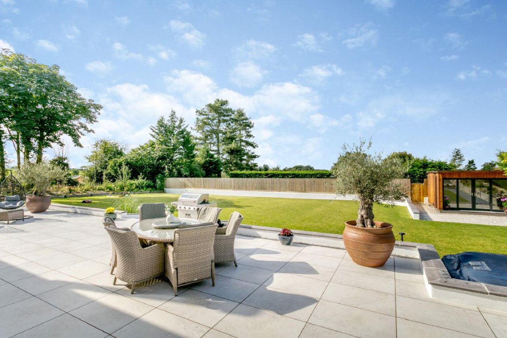 The outside space is equally stunning with an expansive sun terrace leading to a large level lawn, perfect for outdoor gatherings and activities. A garden office is situated at the end of the garden ideal for working from home or a home gym. Tucked to the side of the property is an area with several large, raised planters and a potting shed, perfect for growing vegetables. A sheltered area beneath the balcony provides space for table tennis, while an outdoor shower facilitates cleaning muddy boots and pets. A gated gravel area on the other side of the property provides ample parking for a motorhome or a boat.