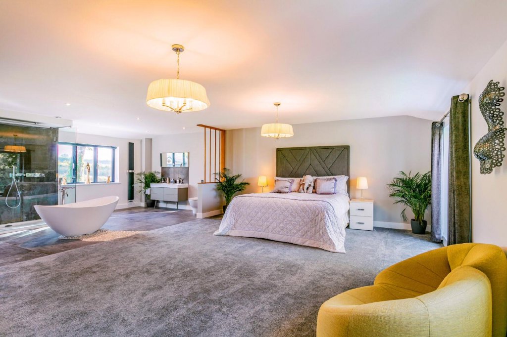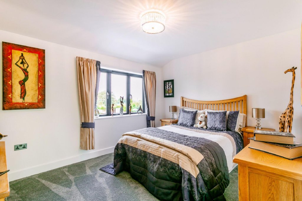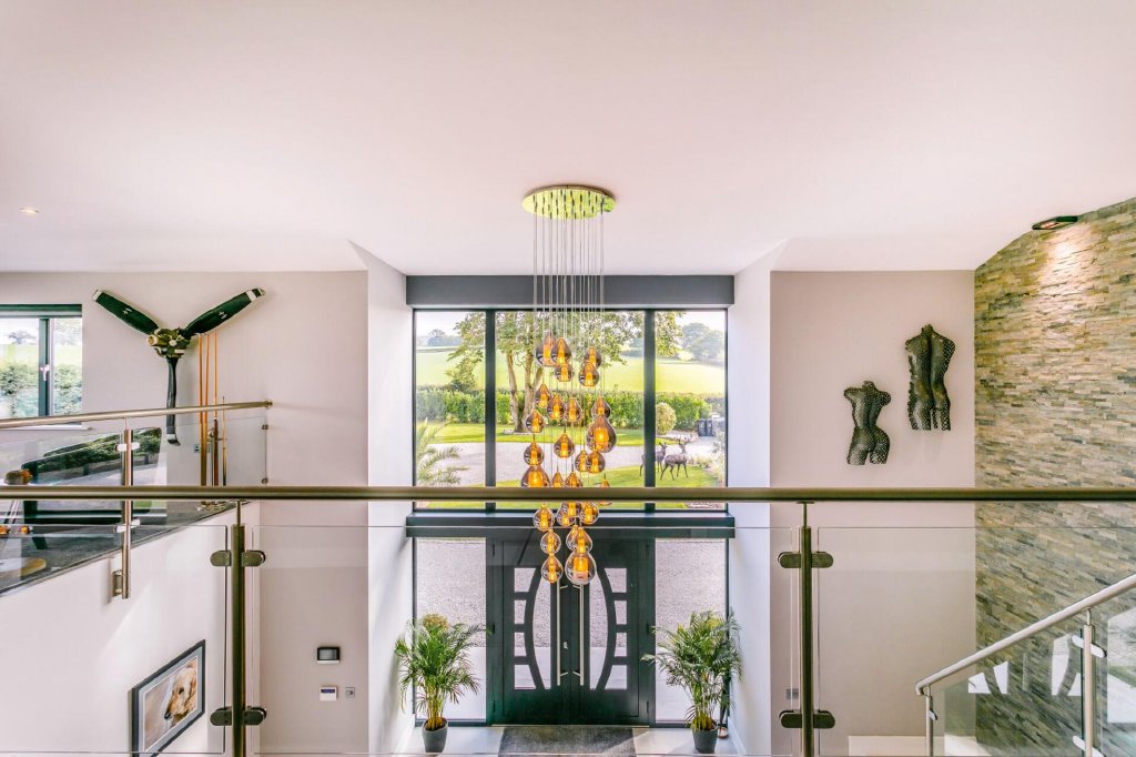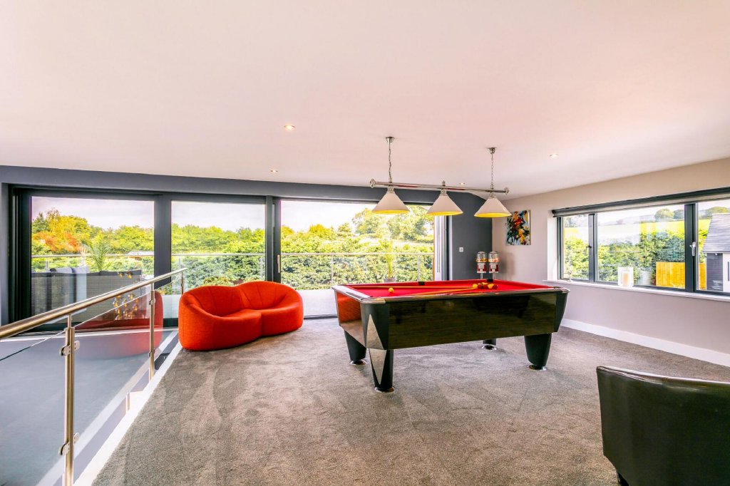 The glazed gallery landing is a true showstopper, with plush thick pile carpet underfoot and fantastic triple aspect views, looking over the double height entrance to the front and the double height dining room to the rear. The front and rear of the property also enjoys floor to roof windows and views beyond, and it is here that is the perfect viewing spot. Extending on from the games room which has ample space for a pool table and seating, there is a large balcony with beautiful rural views.