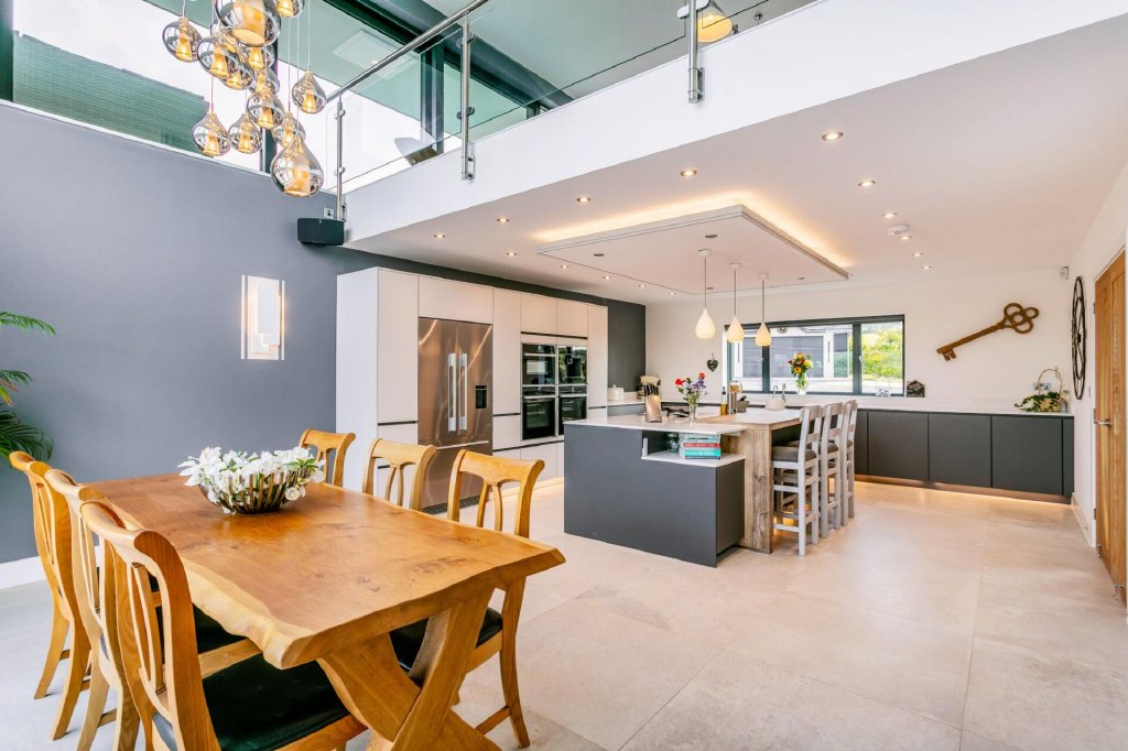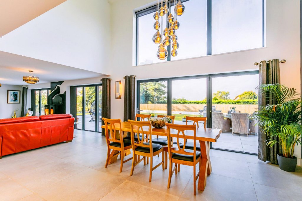 The kitchen seamlessly connects to the dining room which boasts a double height ceiling with statement cluster pendant lights and trifold doors opening out to a sprawling outdoor area comprising of a sun terrace and level lawn garden.