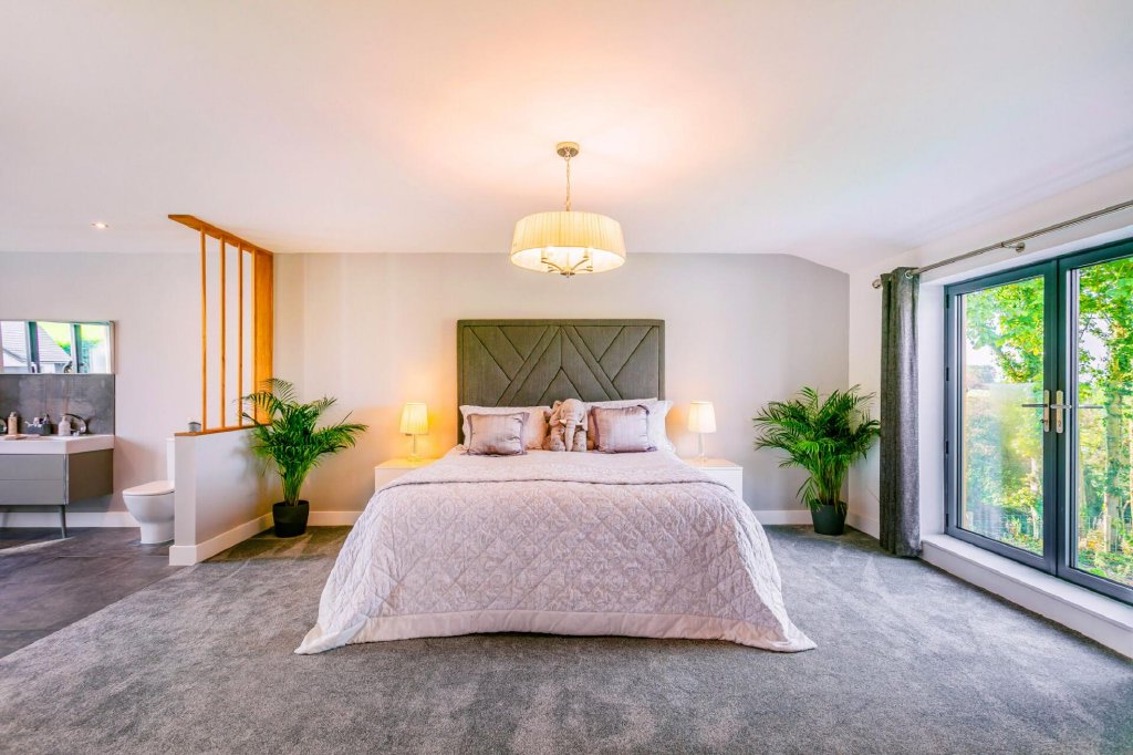 Indulge in ultimate luxury within this master bedroom. The expansive space boasts ample room for a super king size bed and a seating area to enjoy views of the garden from the Juliet balcony. Yet, the most impressive feature of this room lies within the lavish bathroom suite it contains. The opulent suite showcases a sauna, a freestanding bathtub and a state-of-the-art Hansgrohe Axor double shower enclosure. For the ultimate in convenience, a dressing room with fitted wardrobes adjoins this room.