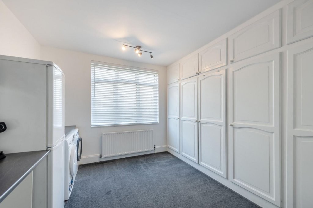 Adjoining the kitchen is a large utility/laundry room with a full wall of floor-to-ceiling built-in storage, space and plumbing for a washing machine and dryer, and room for an additional fridge/freezer, along with useful worktop and shelving space.