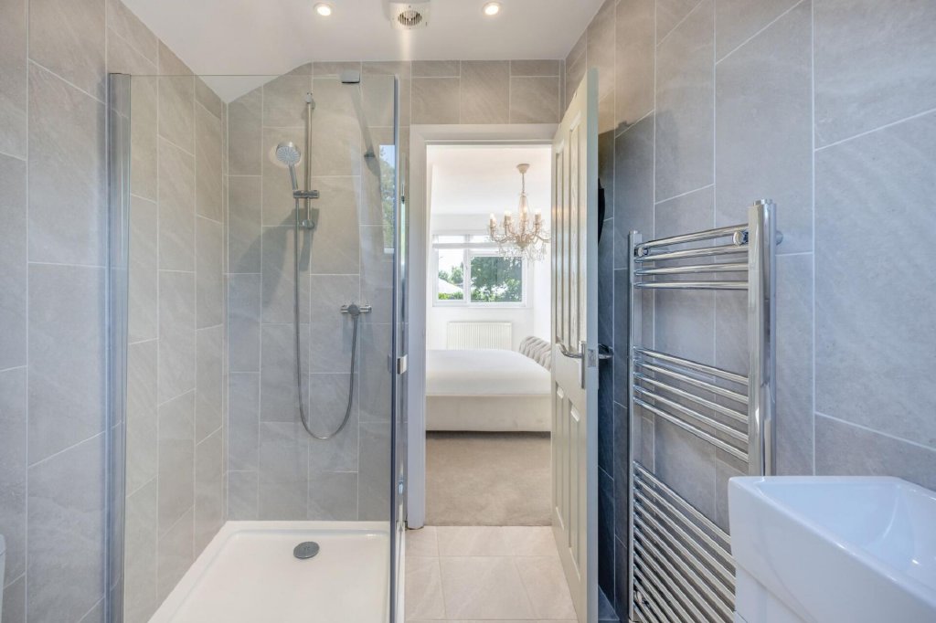The principal bedroom is a light and spacious room, dramatically lit with a low hanging chandelier, adding a touch of glamour. Built in wardrobes provides practical storage which maximises the use of the space. This room also enjoys the added benefit of an en-suite shower room.