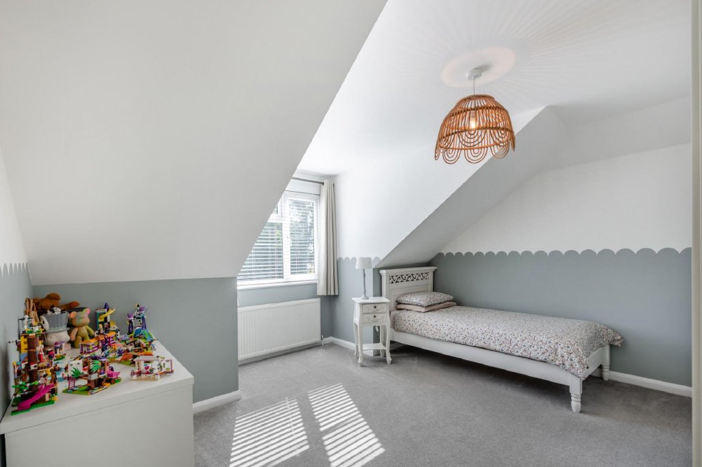 The large, level garden is accessed via French doors from the kitchen/diner and includes a generous sun terrace – perfect for outdoor dining and entertaining. The lawn is bordered by a selection of mature trees and shrubs, increasing privacy and creating a beautiful backdrop.