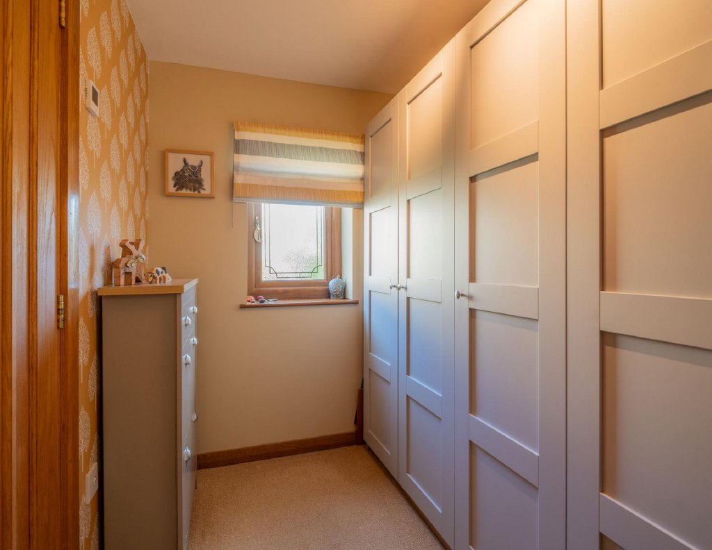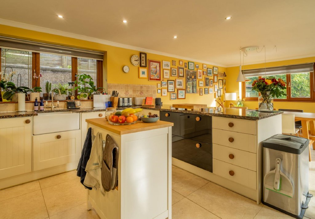 At the heart of the home lies the stunning, dual-aspect kitchen. Designed for modern living, this spacious, light-filled area is ideal for cooking, dining, and gathering. It features contemporary fittings, generous storage, a double fridge/freezer, induction hob, integrated appliances including dishwasher and patio doors leading directly to the landscaped outdoor terrace – a wonderful space for dining under the stars in this renowned “dark skies” location.