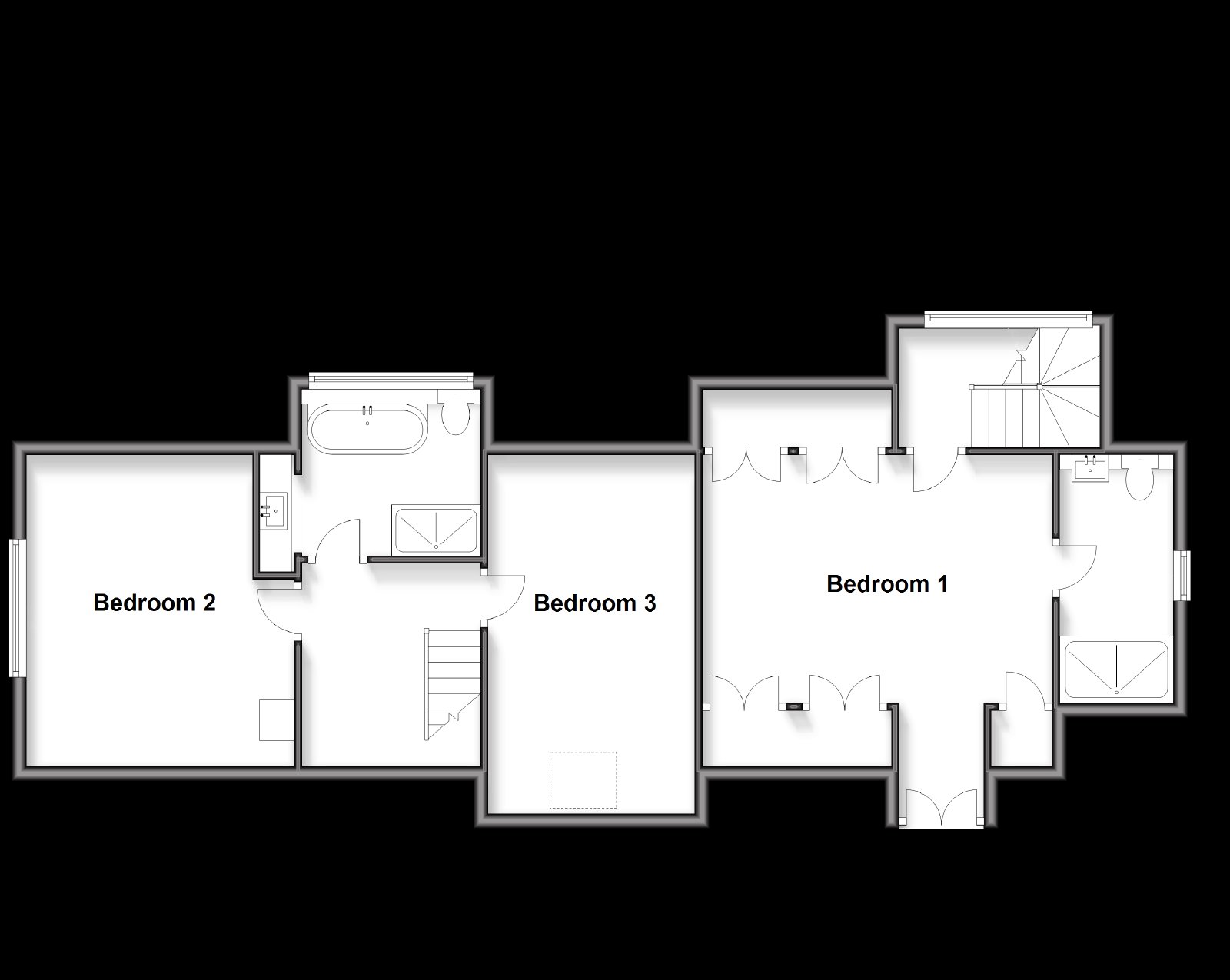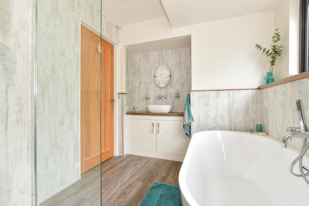 The home’s thoughtful layout includes two staircases, offering the potential for a private guest or family wing. The master suite enjoys vaulted ceilings, a Juliet balcony with distant sea views, extensive built-in wardrobes, and a luxurious ensuite with walk-in shower and heated flooring. Two additional double bedrooms on the first floor each enjoy stunning garden and coastal views, complemented by a stylish family bathroom complete with a separate walk-in shower and freestanding bath.