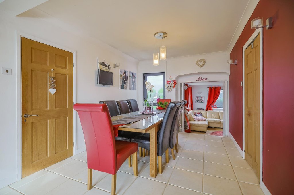 A generous dining and family area provides the perfect setting for entertaining, with direct access to a walk-in pantry with fitted shelving. From here, you have access to the utility room and three steps leading down to the snug/TV room.