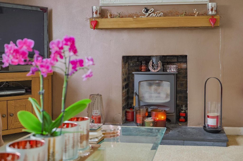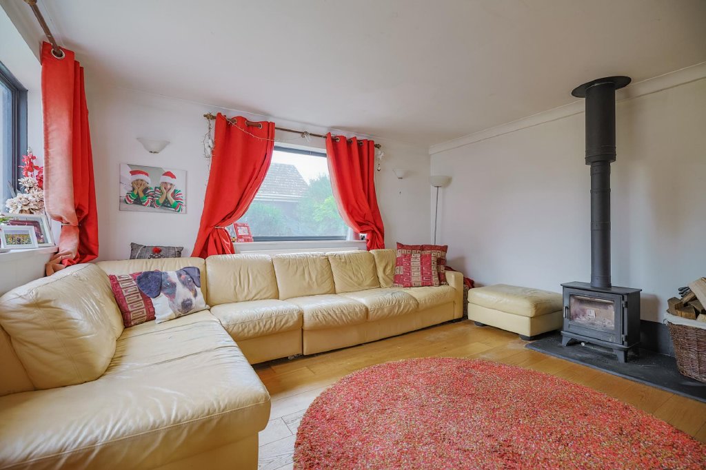 Three steps down, double folding doors open into a warm and inviting snug – currently used as a TV room – featuring oak flooring and dual-aspect windows overlooking the garden. A wood-burning with slate hearth adds a cosy focal point, creating the perfect space for relaxing.