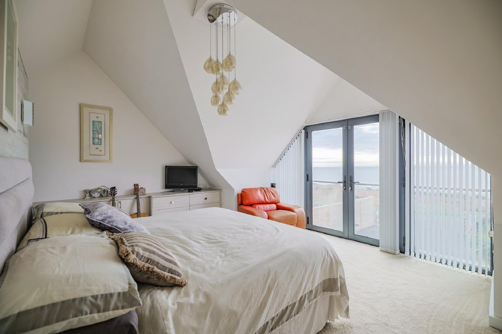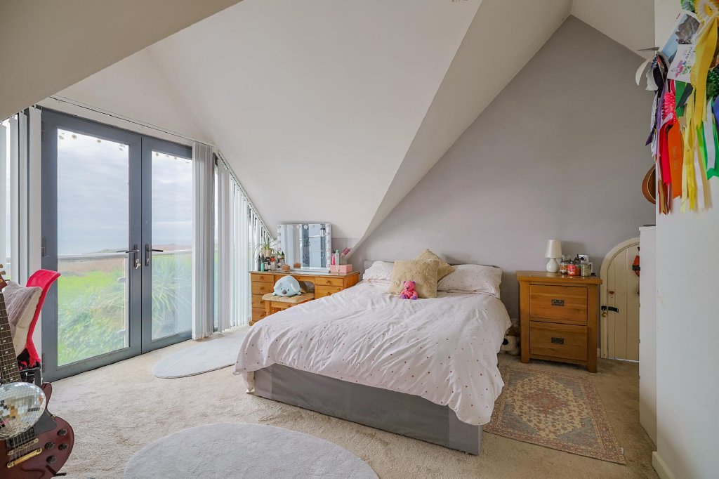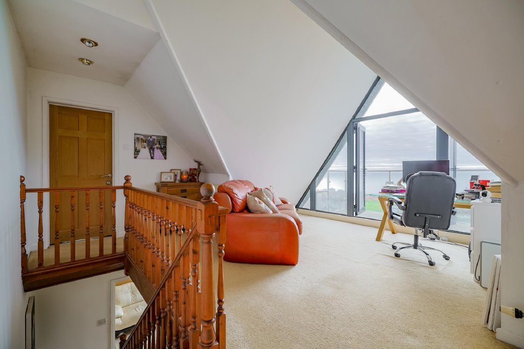A carpeted staircase leads to an impressive open landing with a vaulted ceiling, spot lighting, and a striking triangular feature window framing breath-taking sea views. Double doors open to a balcony with a glass balustrade — the perfect spot to take in the coastal panorama. This versatile landing offers space for a reading nook, study area, or informal lounge.