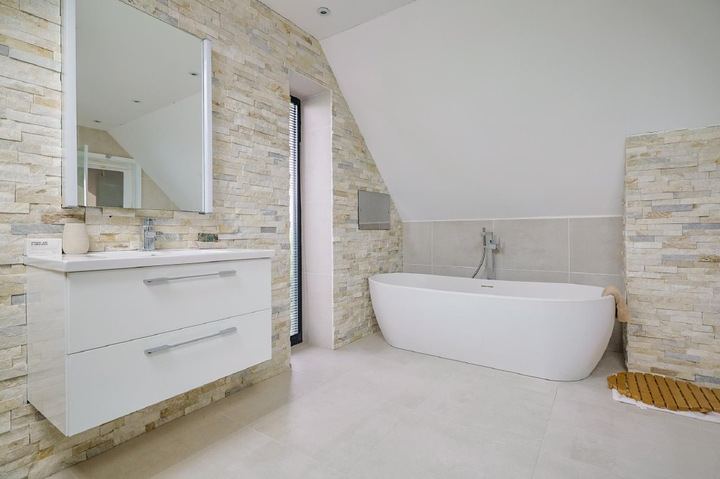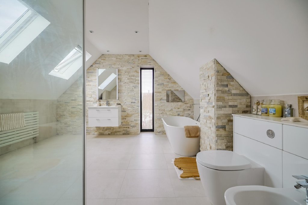 An archway leads to a further storage area and the lavish en-suite, which boasts a four-piece suite including a WC, bidet, freestanding feature bath with floor-mounted tap and handheld shower, waterproof TV, wash basin with storage, a large walk-in shower, feature radiator, tiled flooring, tiled walls, vaulted ceiling with spot lighting, extractor fan, and both Velux and full-height windows to the rear.