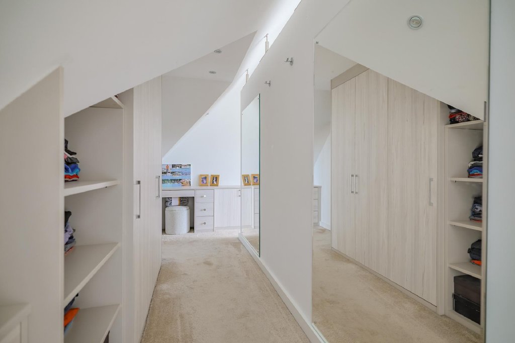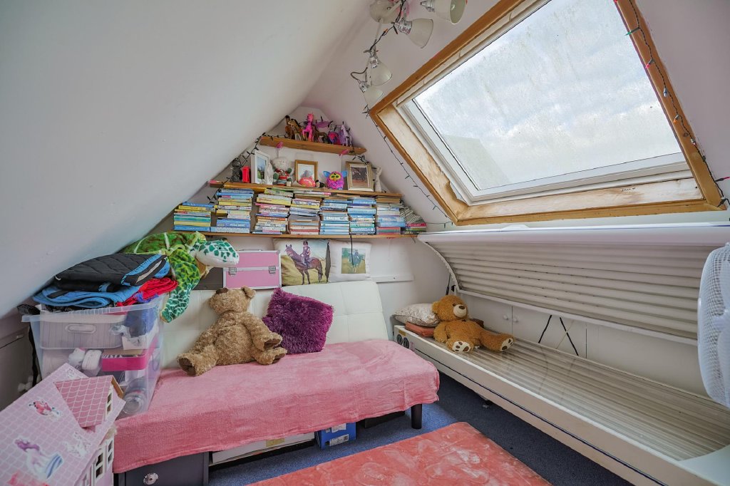 A discreet eaves door leads to a “secret” room – fully carpeted with vaulted ceiling and Velux window – perfect for use as a playroom, hobby room, or additional storage.