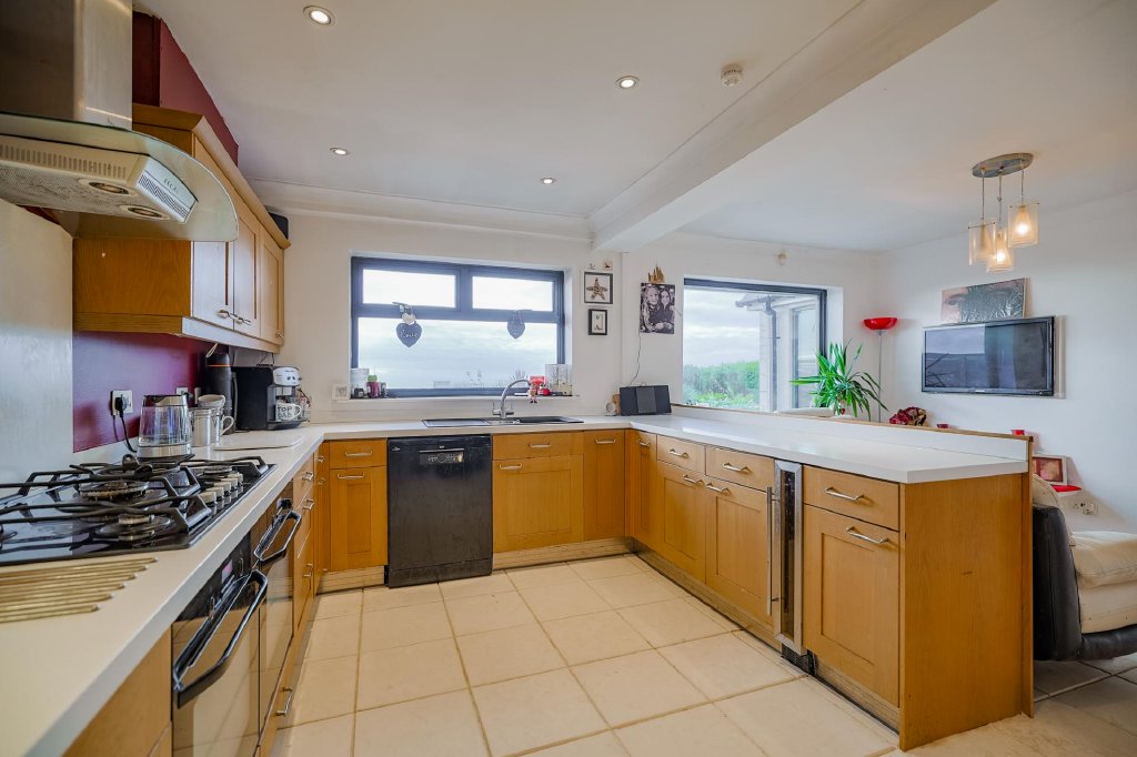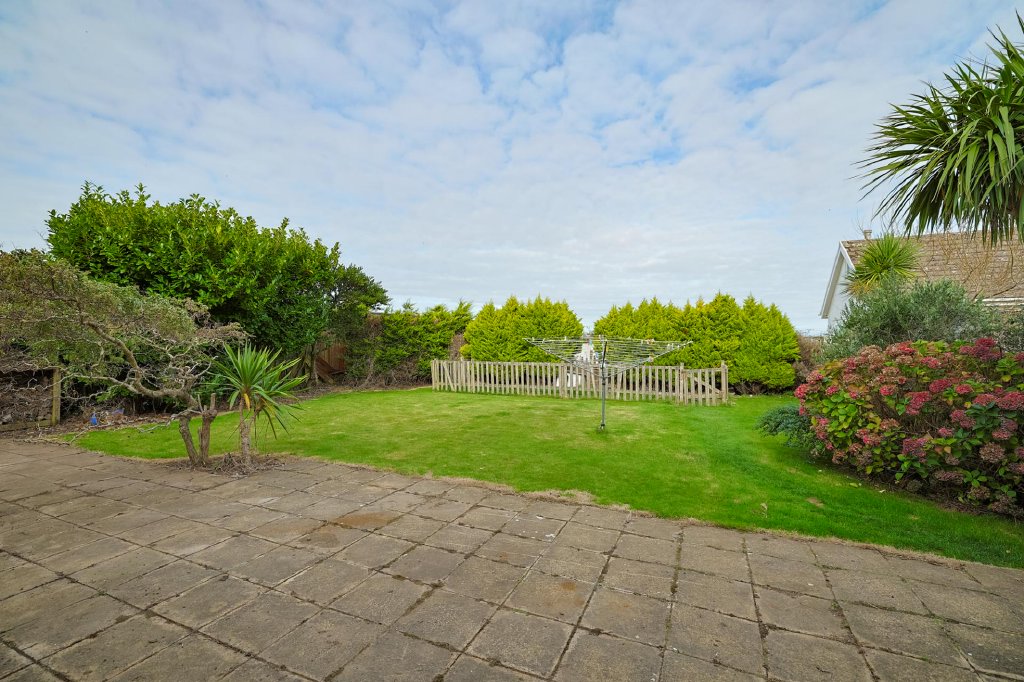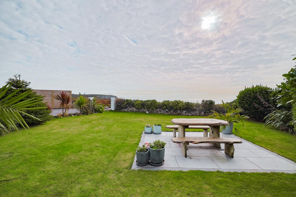 To the front, a tarmac driveway extends to the rear, providing ample parking for several vehicles, complemented by a neatly kept level lawn and paved seating area – the perfect place to relax and soak in the coastal scenery. The property’s elevated position ensures uninterrupted sea views that can never be built on, preserving its unique outlook for generations to come.