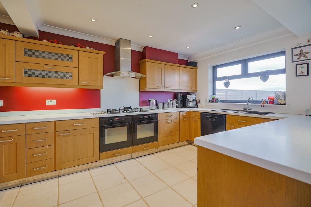 The heart of the home — this impressive open-plan space is perfect for modern family living and entertaining. Two large front-facing windows capture the incredible coastal outlook and flood the space with natural light, while a glazed door opens to the rear garden. The room is laid with tiled flooring and illuminated with both ceiling and spot lighting.