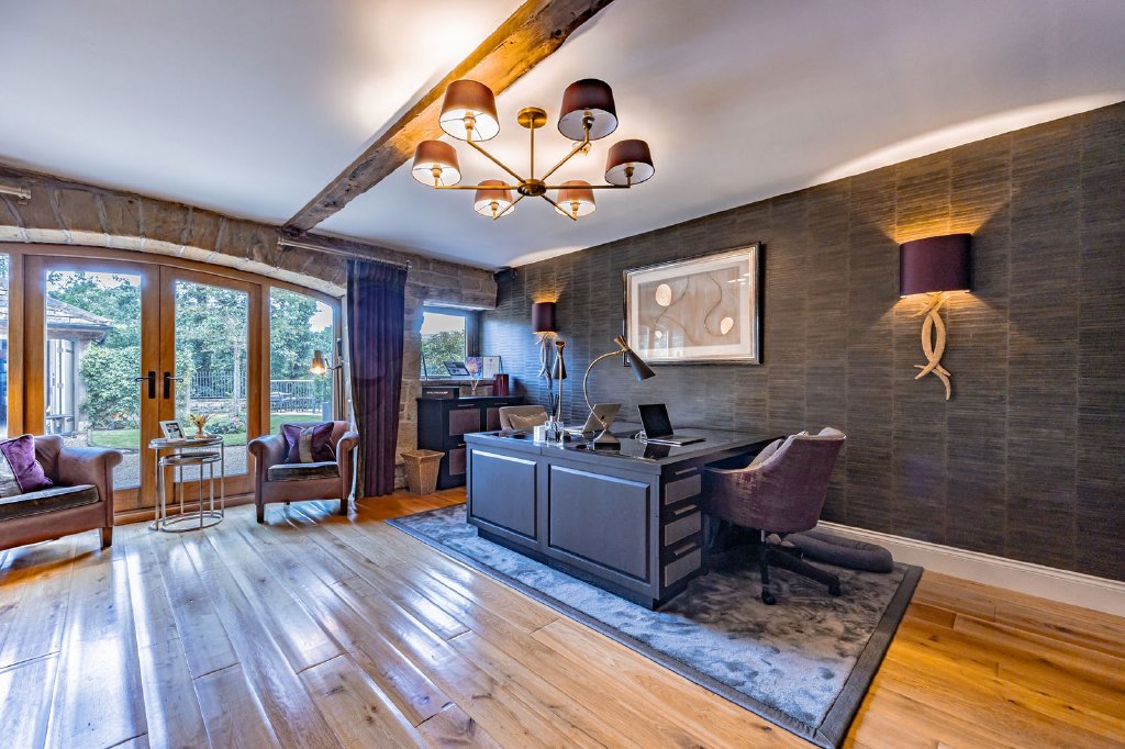 An original door opens into a beautiful reception hallway/music room, with underfloor heating and Yorkshire stone flooring and two storage cupboards. Double doors lead to a home office/study with underfloor heating and undulated oak flooring, bespoke fitted office furniture and a dual aspect gas fire which can be seen from both the study and grand reception hallway. Leading on from the hallway is a beautifully appointed double bedroom suite, with walk in dressing room and ensuite shower room, with double doors to the front courtyard. Underfloor heating is installed to the whole of the ground floor.