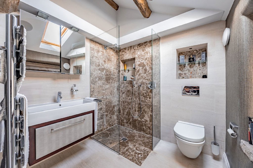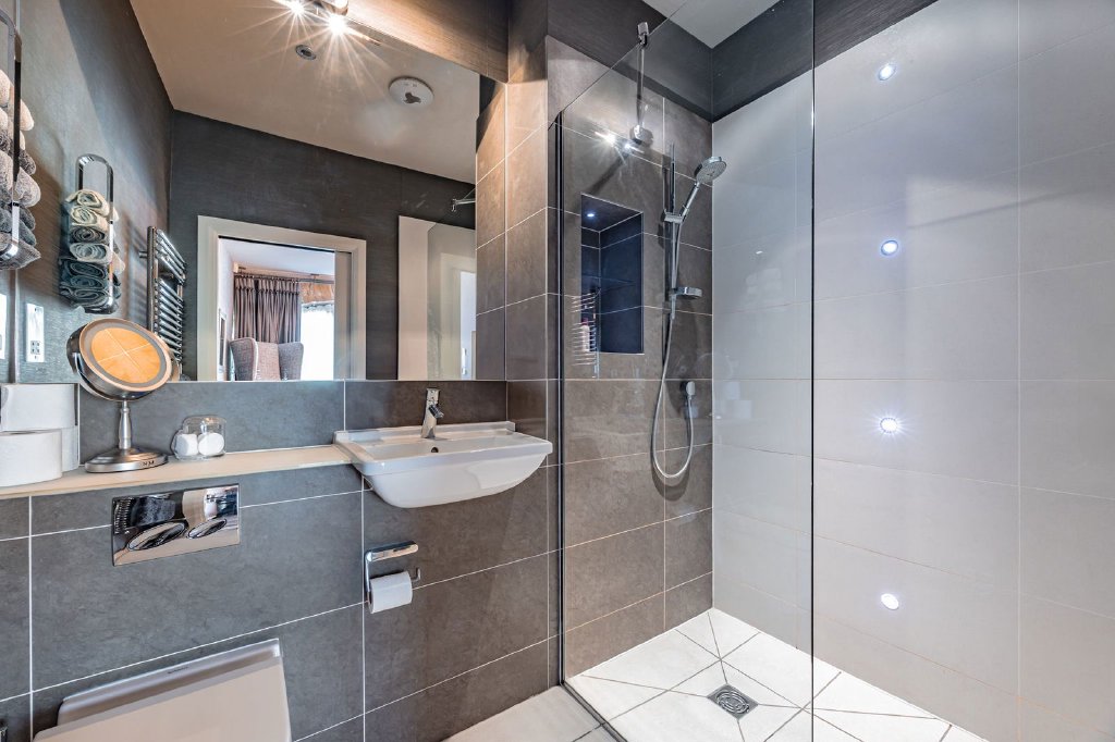To the rear of the ground floor is a second kitchen with modern hi-gloss wall and base units with an electric oven and hob and a dishwasher. Adjacent to the kitchen is an electric shower room. There are two further double bedrooms to the ground floor, both with bespoke fitted furniture. One of the bedrooms has a bespoke hand crafted leather headboard with a window seat overlooking the rear garden. The other bedroom has dual aspect windows and carefully designed fitted wardrobes and storage and décor inspired by a ski lodge. Between the two bedrooms is a sitting room/den with Yorkshire stone flooring and views to the rear garden. A luxury bathroom with an exposed stone wall, corner bath and walk in shower completes the ground floor. The ground floor is ideal for dependent relatives or independent teenagers.
