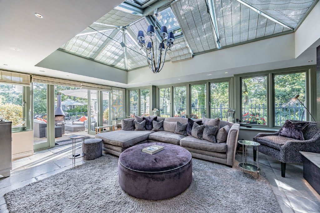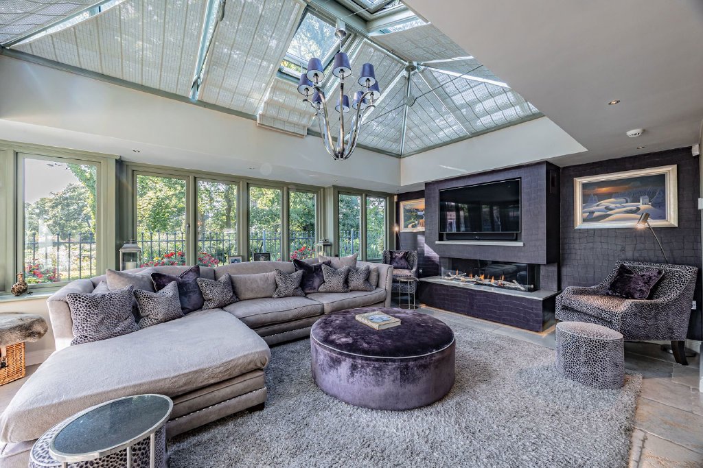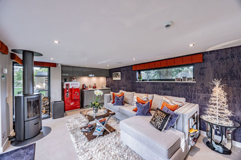 There is a stunning custom built lodge/summer house towards the side of the garden, ideal as an executive home office. It has been well insulated and offers indoor and outdoor speakers, a Scandinavian log burner, a kitchenette with a fridge and sink, underfloor heating and Bi-folding doors to a generous paved patio area. To the other side of the garden is a breeze house which has been adapted to create a sports bar with bespoke seating, a TV point, lighting, drinks fridge and kick board heating.