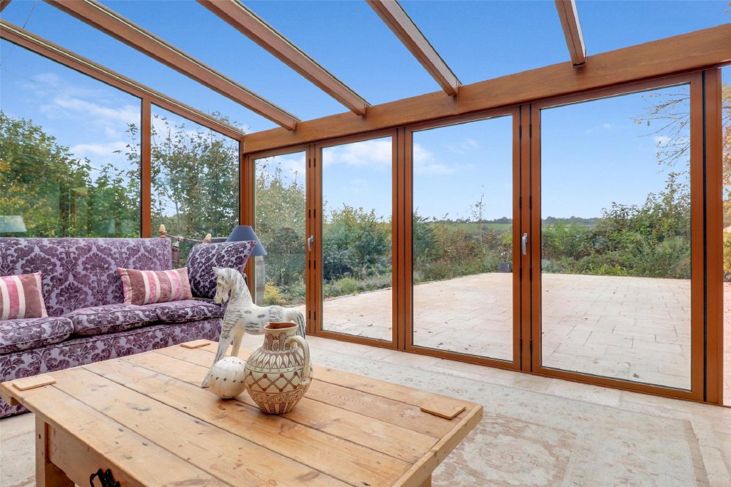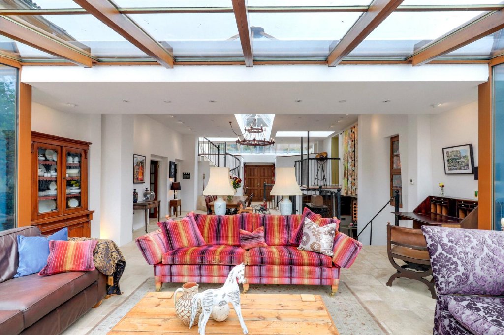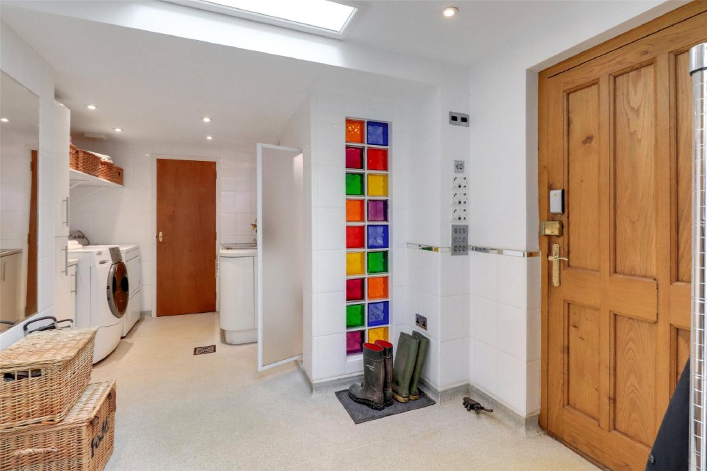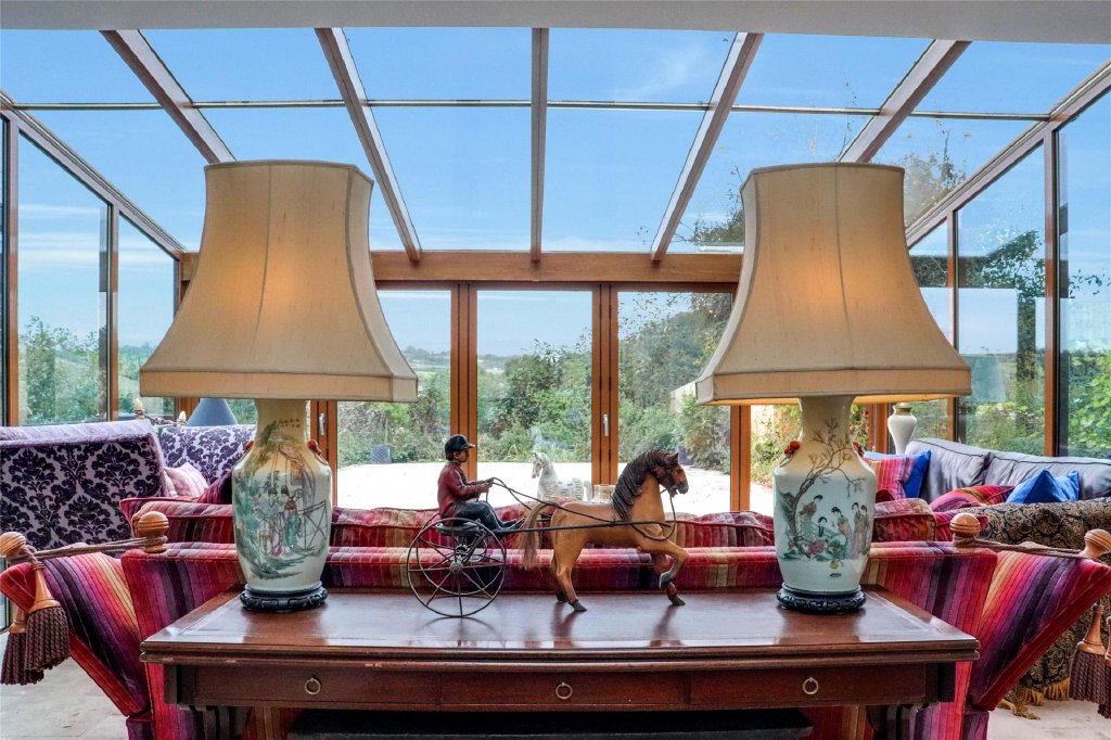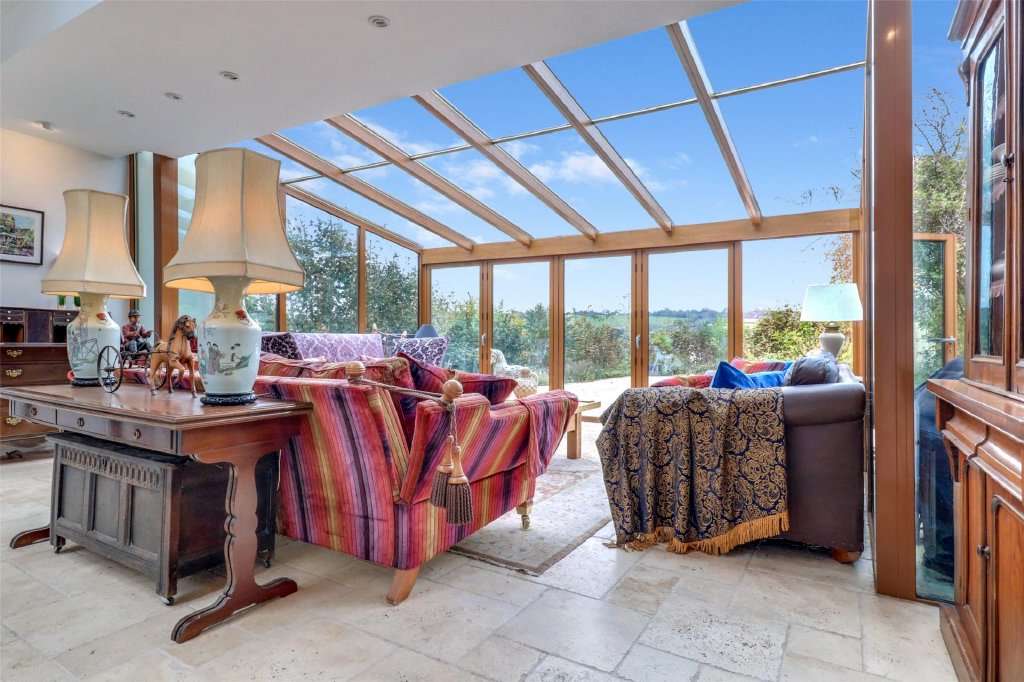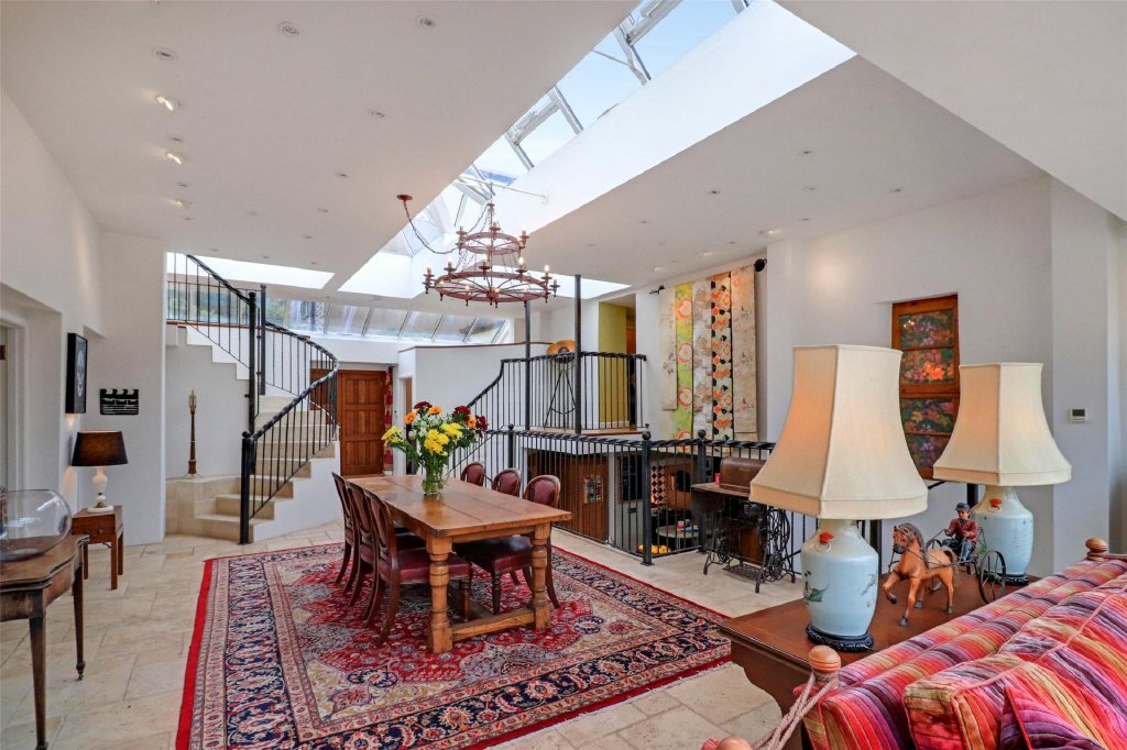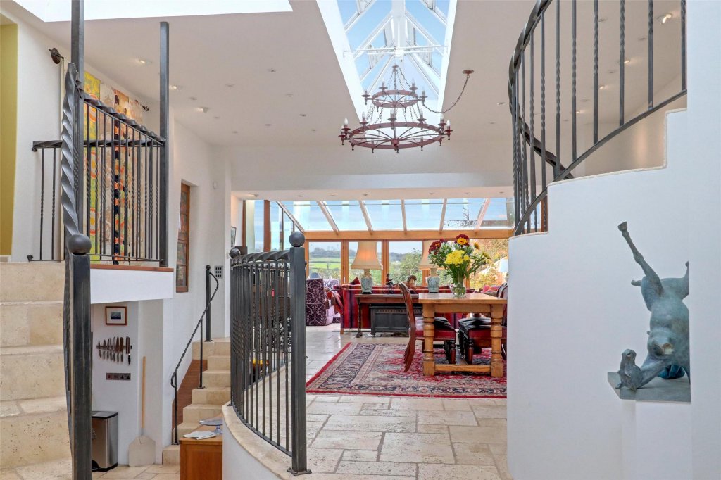High Bullen Farm is a unique and striking property, parts of which date back to the 1800s, accessed via its own private driveway and approached by ample gravelled parking. Steps lead down to an impressive oak double front door, reclaimed from a local church, which opens into a resplendent reception hall. This space exudes a real “wow” factor, featuring a vaulted glazed ceiling with automatically controlled openings that respond to temperature and rainfall. Natural light floods the room, while Italian limestone flooring flows seamlessly throughout the ground-floor reception areas.