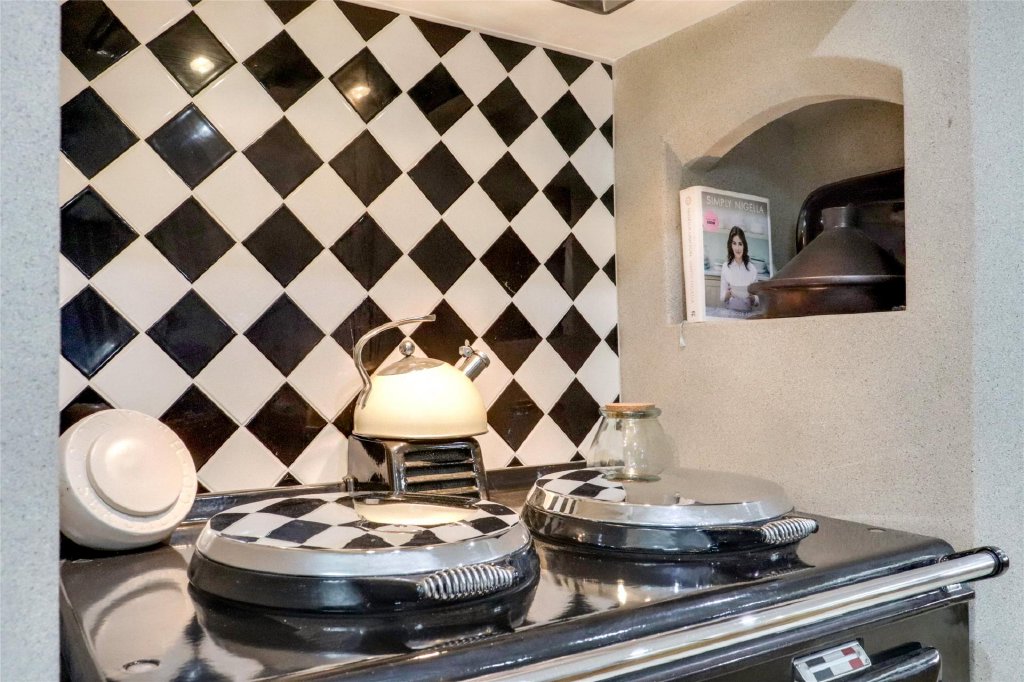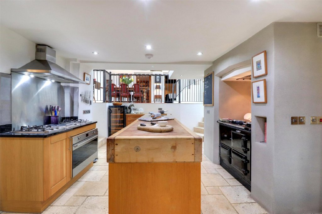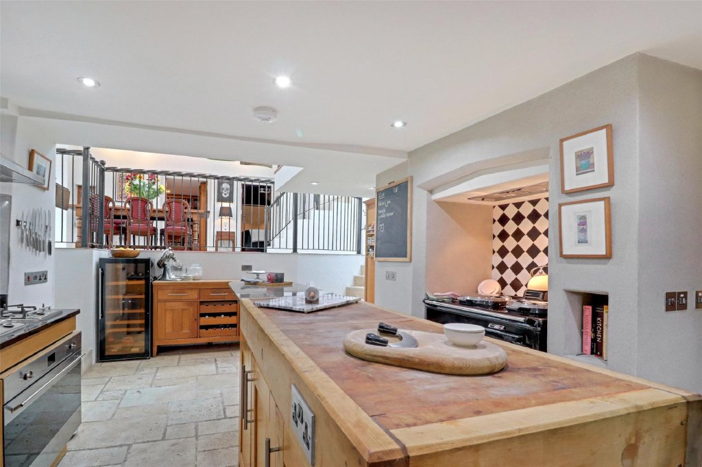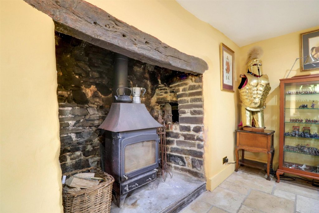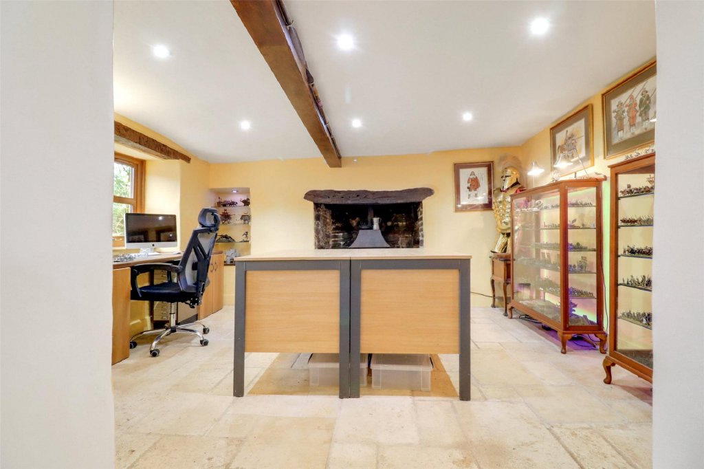 The kitchen, accessed down steps from the reception hall, is a quintessential country-style space featuring an electric AGA, granite worktops, a butchers block with attached marble breakfast bar, a large SMEG oven, American fridge freezer, a wine fridge, and larder. Doors lead off to a hobbies/games room, complete with a charming inglenook fireplace with log burner and bread oven, as well as a cosy lounge with open fire, perfect for atmospheric winter evenings.