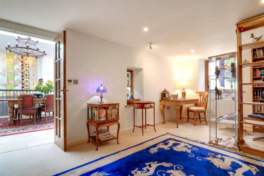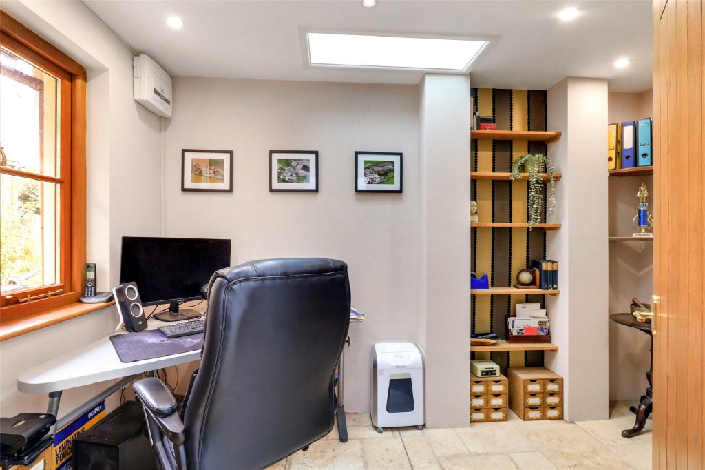 The heart of the house is the dining area, which leads through to a conservatory with bi-folding doors opening onto a raised terrace, seamlessly connecting indoor and outdoor living. The library, which could double as a fifth bedroom, equipped with a built in Murphy bed and a reading corner, sits adjacent, along with a soundproofed cinema room, home office, and a practical utility room with separate external access. This utility space includes a wet room with spa shower, ideal for kicking off those muddy wellies or cleaning dirty paws!