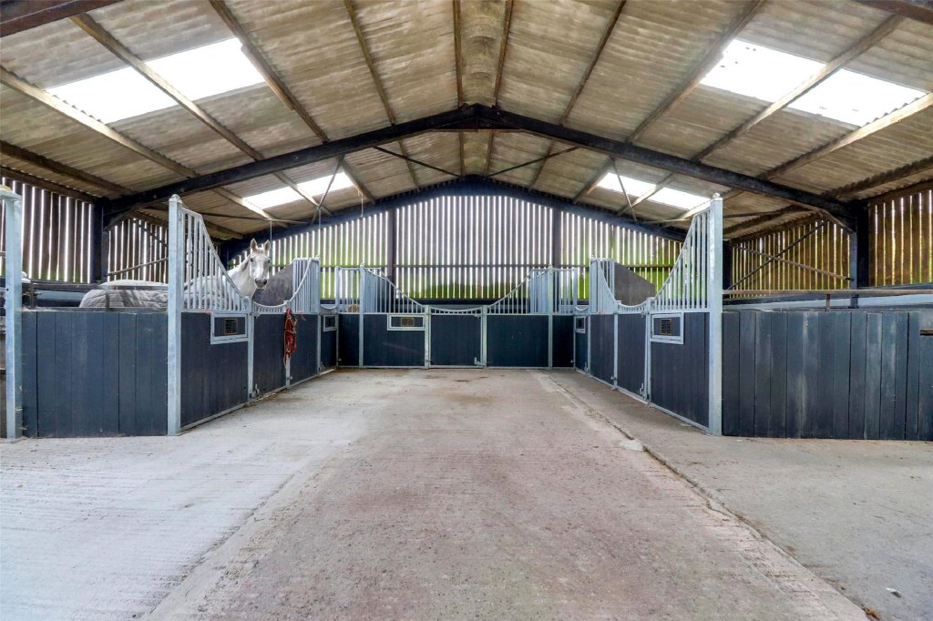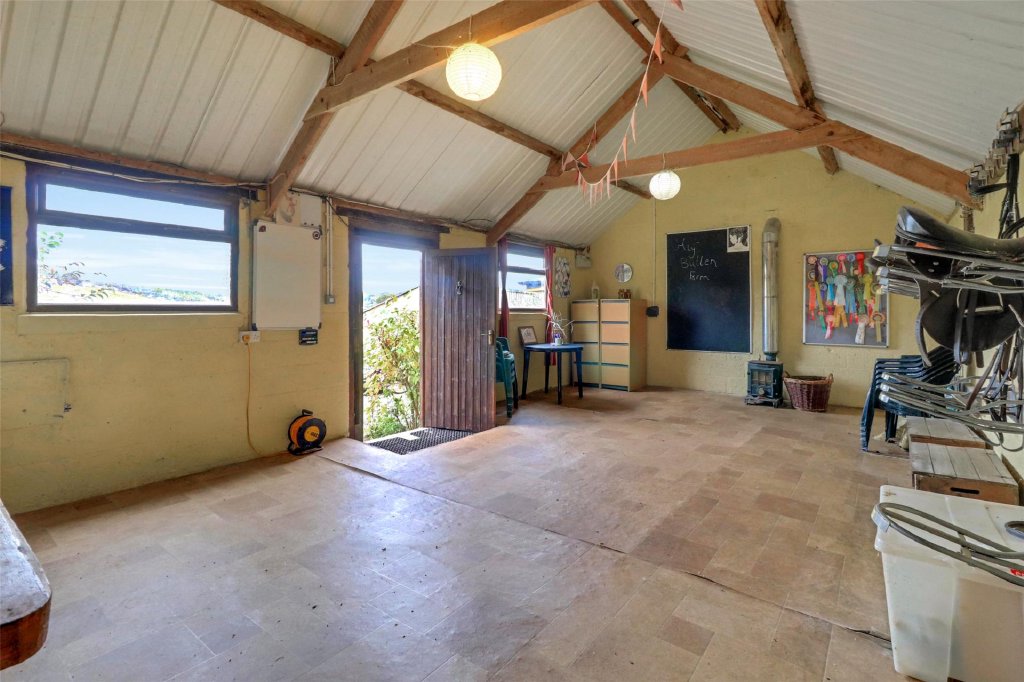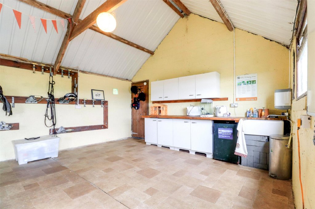 Additional outbuildings include a block and stone-built former stable block with mezzanine, hay loft, and separate mains power, plus a second building comprising a potting shed, open-fronted car port, feed store and tack room with kitchenette and woodburner, making tack cleaning or stable management lessons with the Pony Club a pleasure rather than a chore.