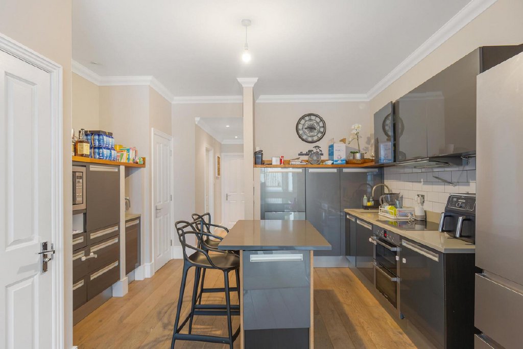 The heart of the home is a magnificent full-width kitchen and breakfast room with bespoke cabinetry, integrated appliances, and bi-fold doors that open seamlessly onto a sun-drenched, south-facing walled garden. The elegant double reception features soaring ceilings, original cornicing, a feature fireplace, and expansive bay windows.