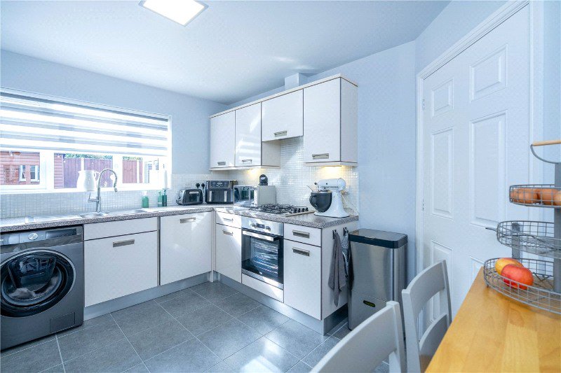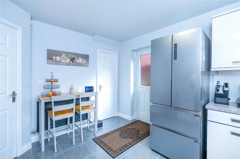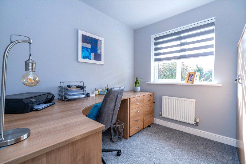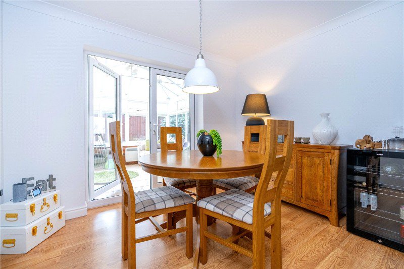 Outside, there is a neat front garden with driveway parking leading to the garage. The rear garden is fully enclosed, mainly laid to lawn with a patio seating area and well-kept borders, ideal for outdoor entertaining.