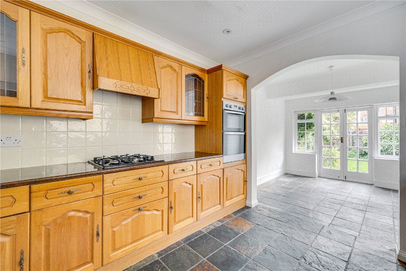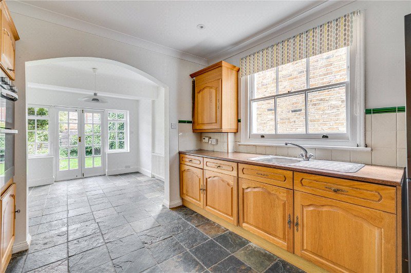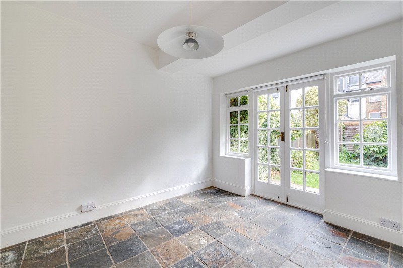 To the rear of the property lies a superb dining room, seamlessly connected to a well-proportioned kitchen. French doors open directly onto a private south facing garden, providing the ideal layout for al fresco dining and indoor-outdoor living.